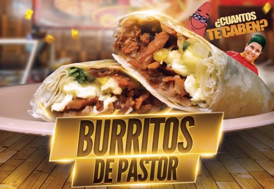 2 Burritos grandes en tortilla de harina con frijol bayo, carne de trompo, queso asadero, piña, cilantro y cebolla.