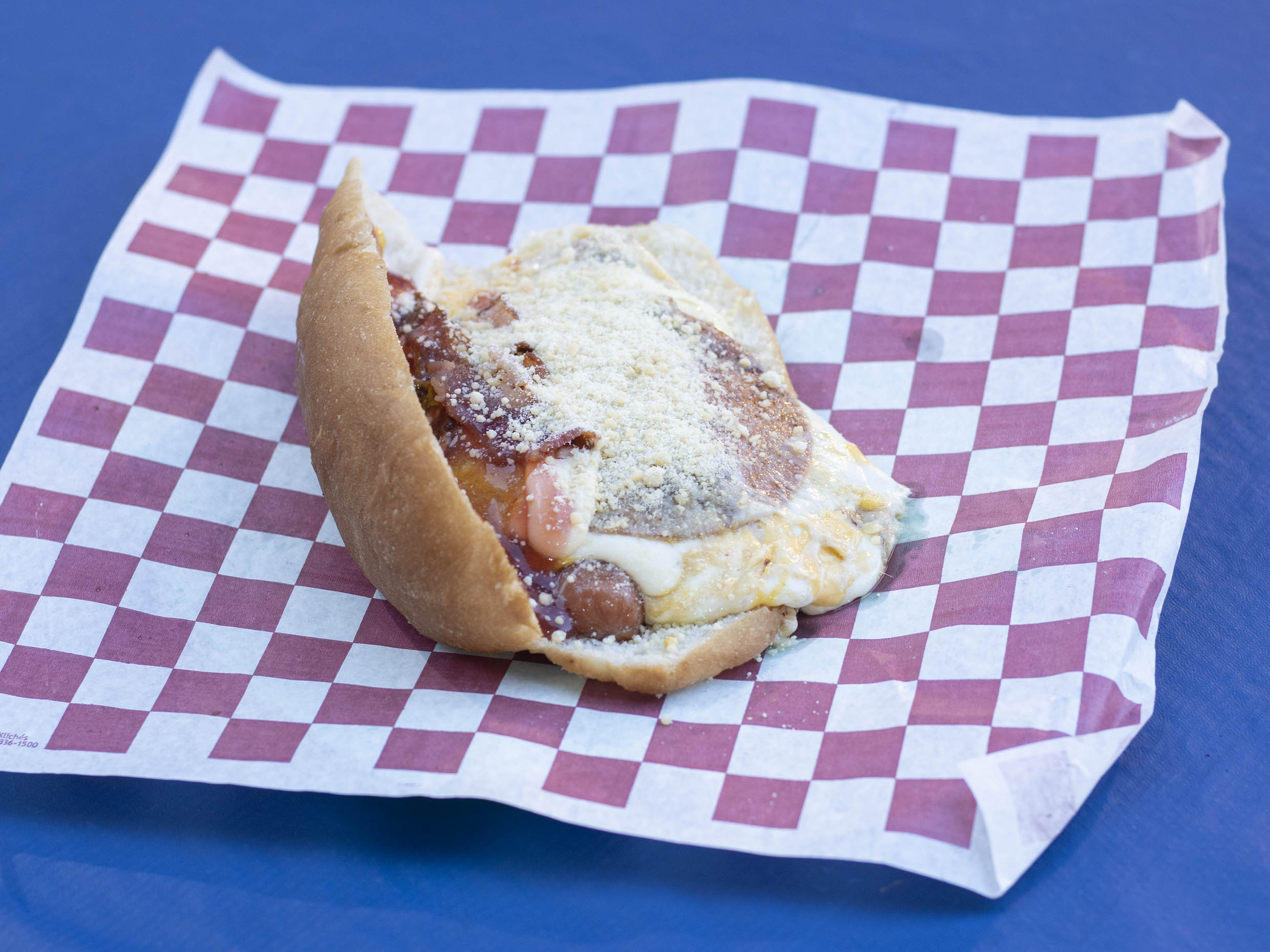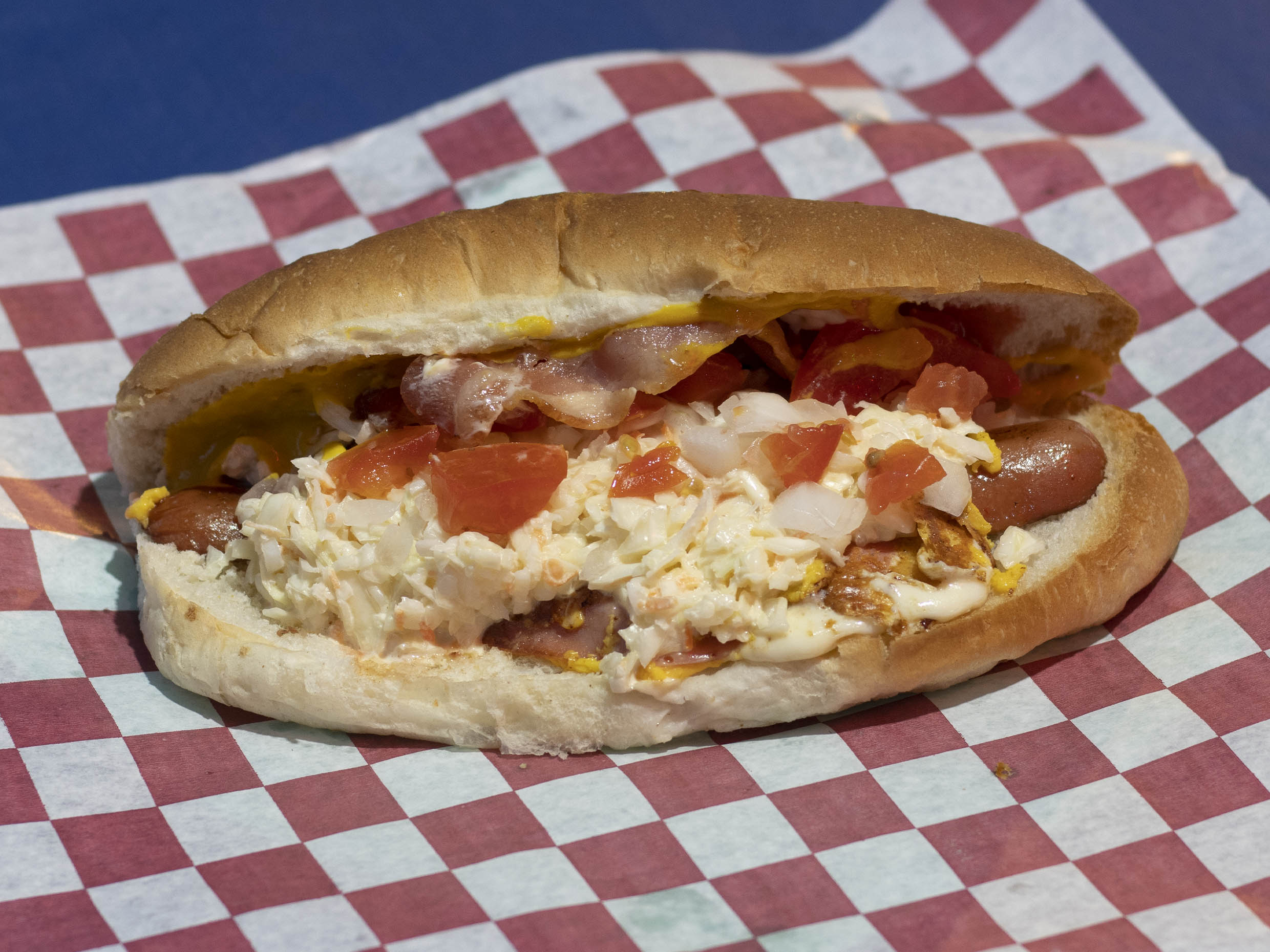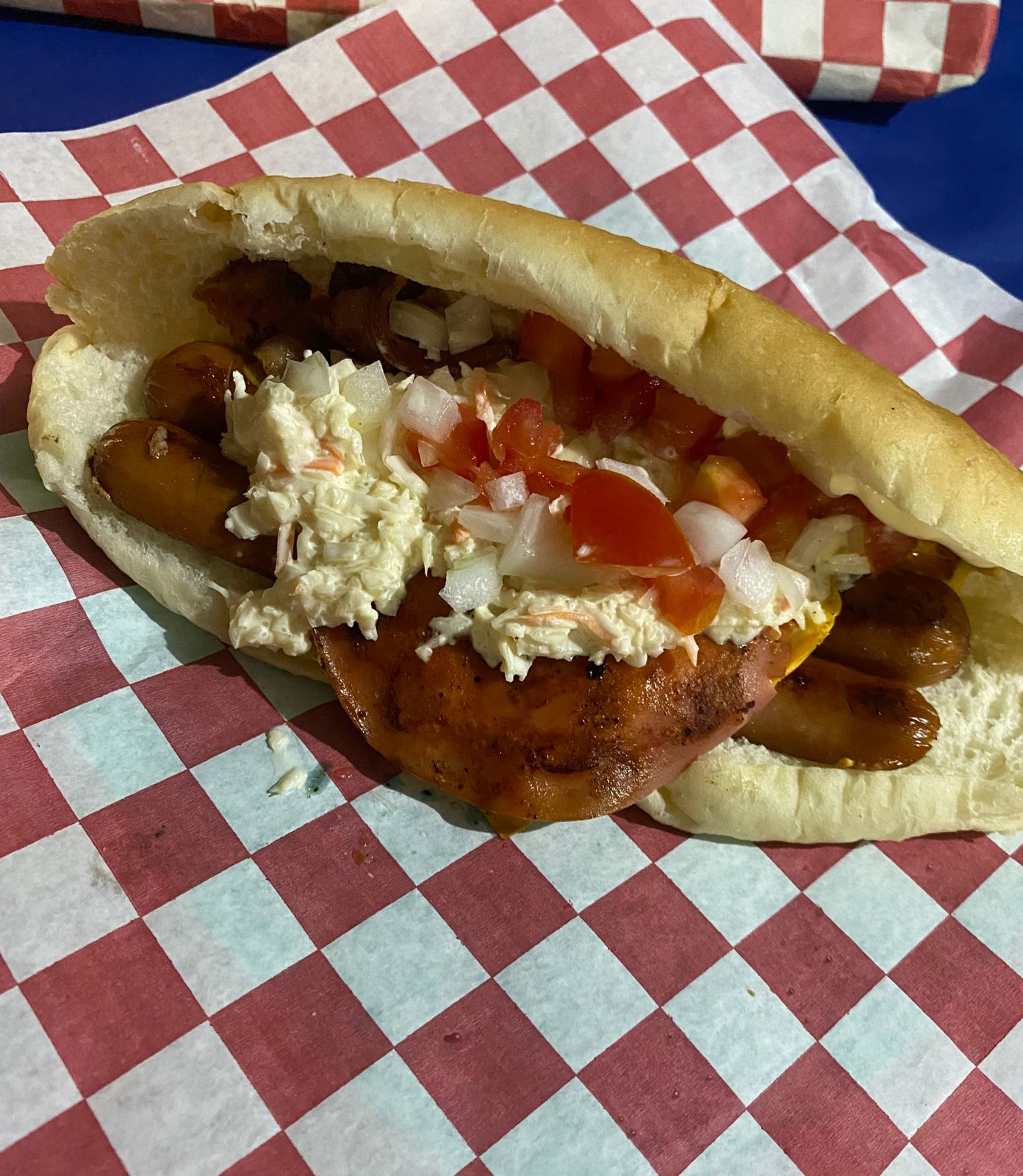 Doble carne salchichón, jamón, queso amarillo, queso asadero, tocino, ensalada de col,tomate, cebolla, mayonesa, mostaza y cátsup.