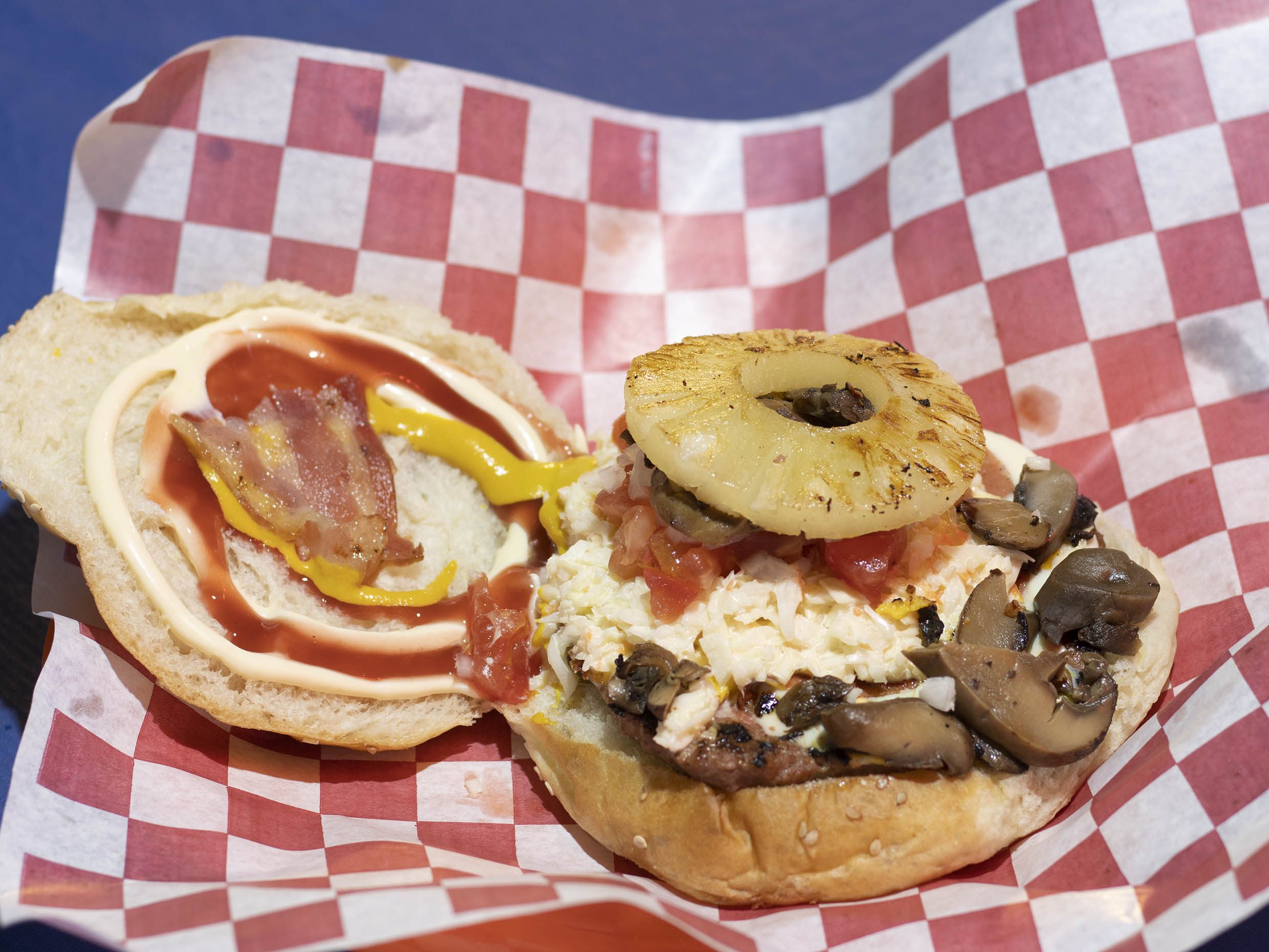 120 gramos de carne, jamón, queso amarillo, queso asadero, tocino, piña, y champiñones a la parrilla, ensalada de col, tomate, cebolla, mostaza, mayonesa y cátsup.