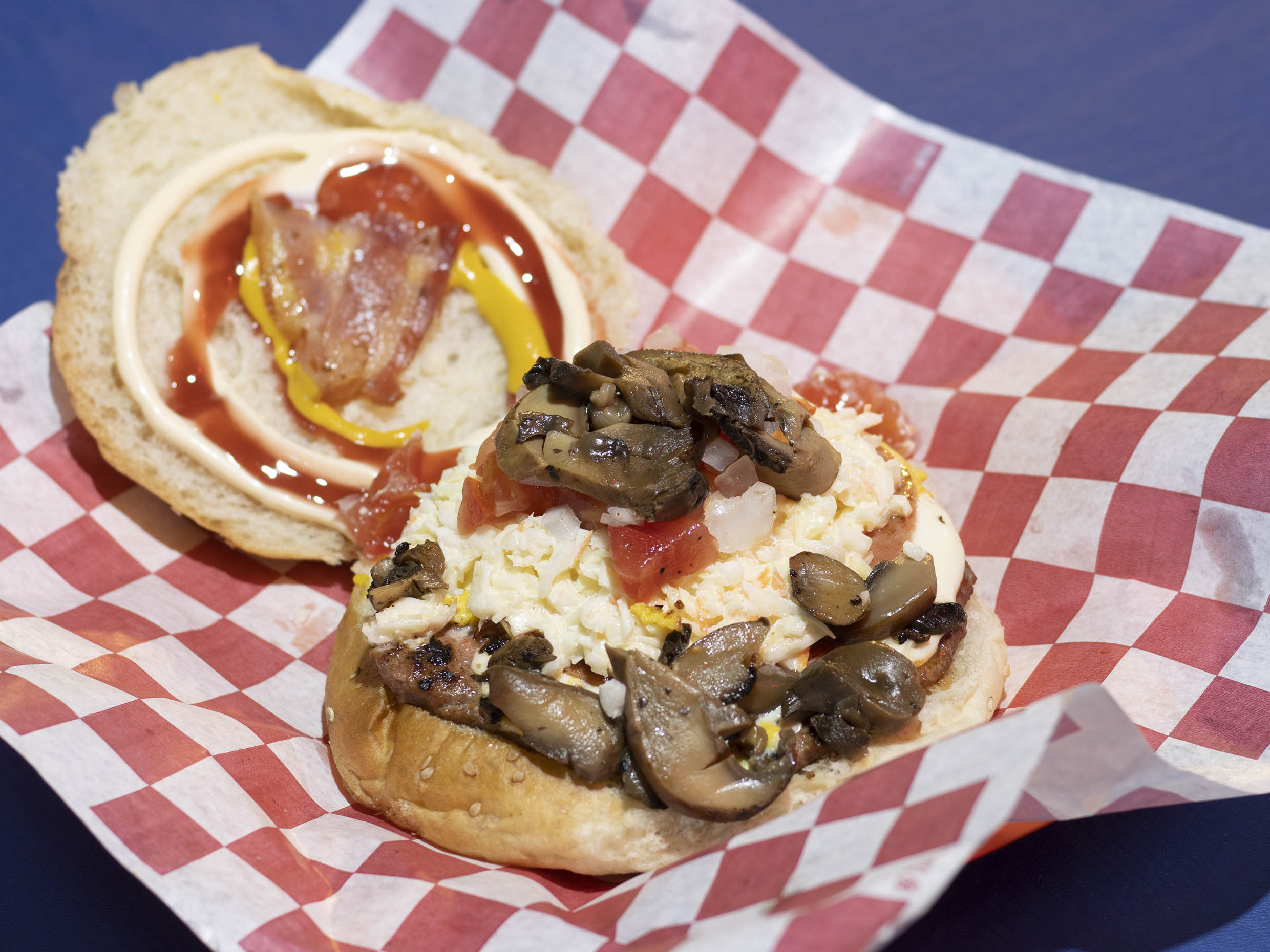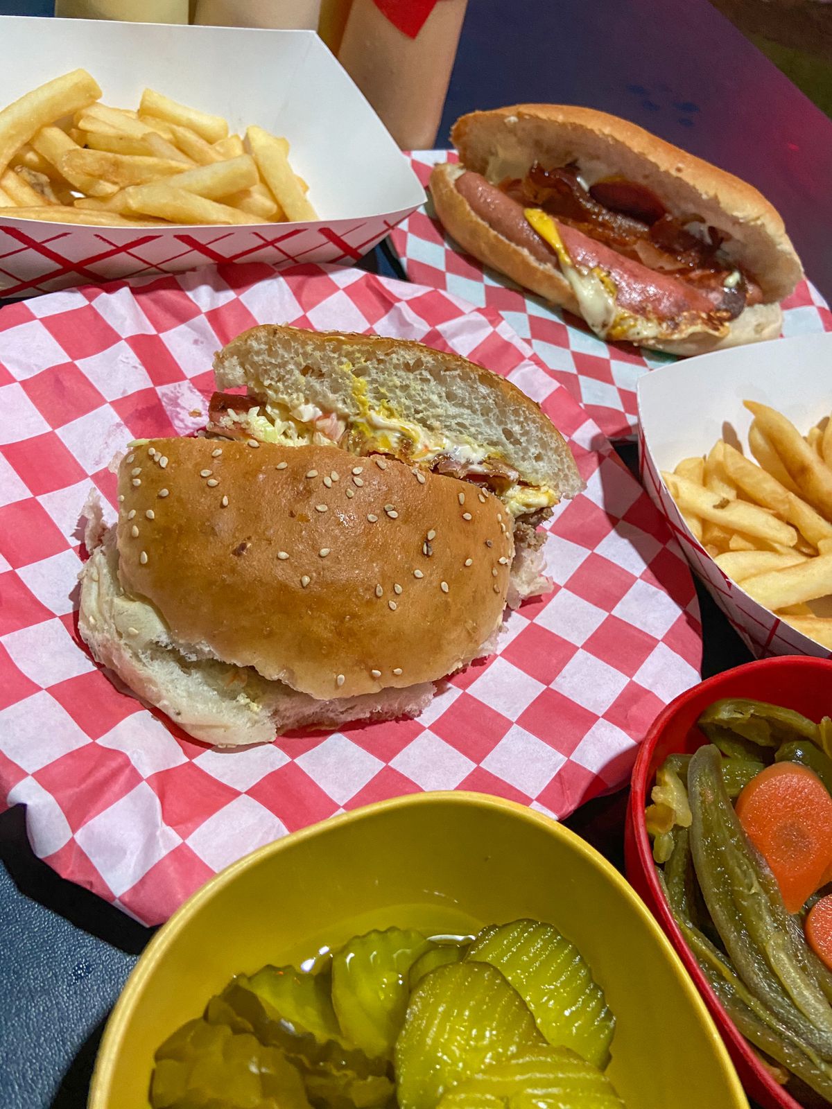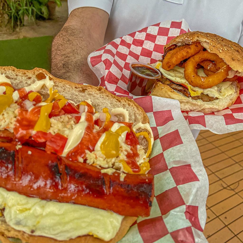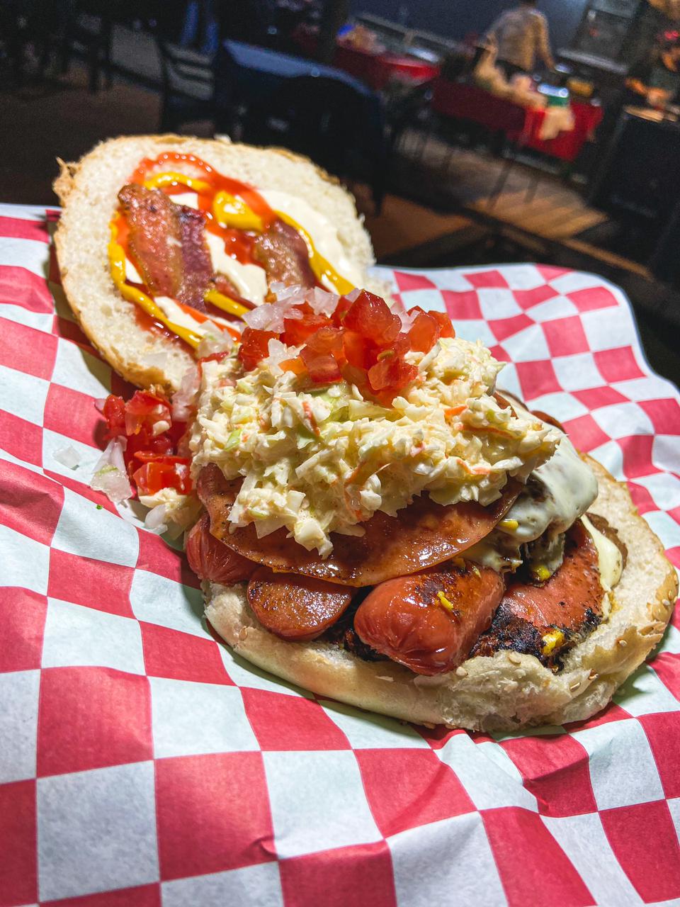 Doble carne, salchicha de pavo jamón, queso amarillo, queso asadero, tocino, ensalada de col,tomate, cebolla, mayonesa, mostaza y cátsup.