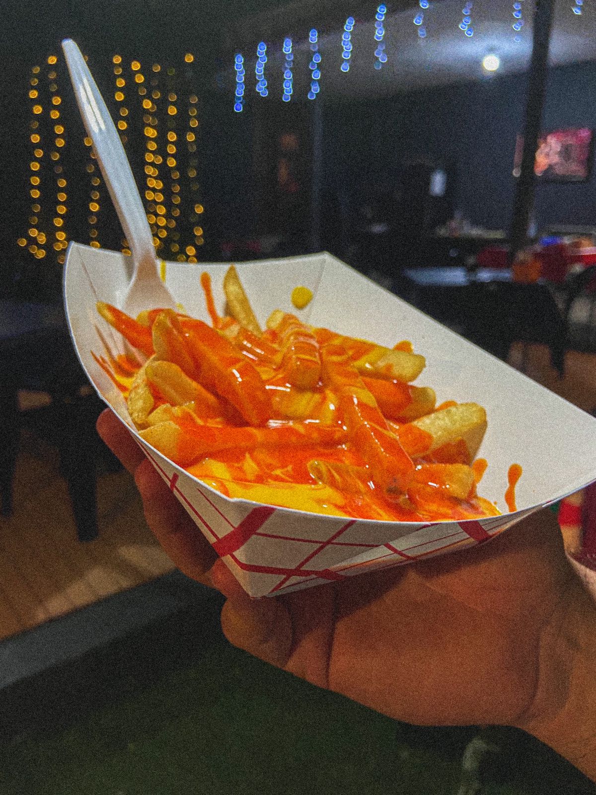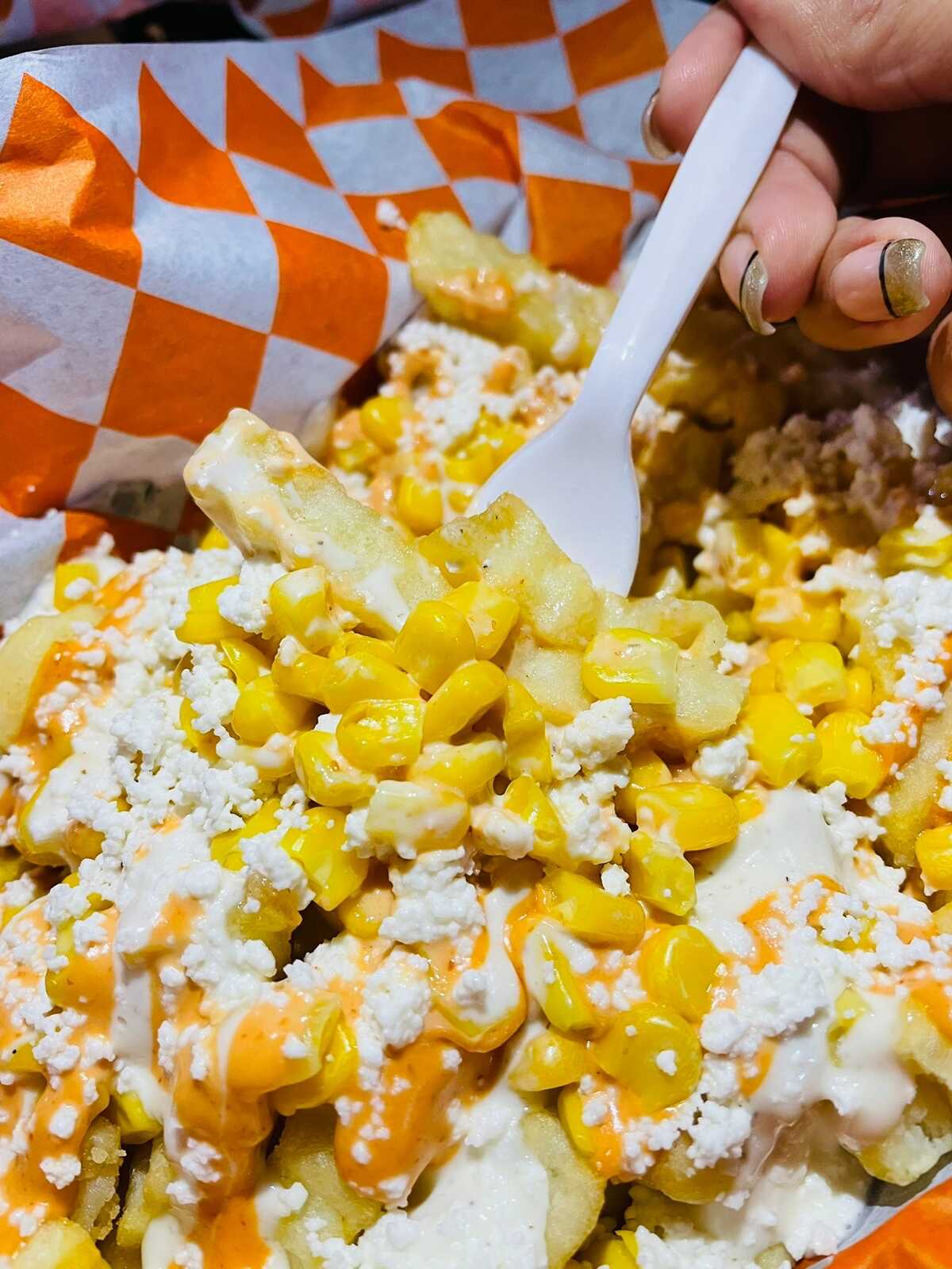 200 gramos de papas a la francesa, 100 gramos de elote amarillo desgranado, queso cheddar, buffalo, aderezo especial, aderezo buttermilk ranch y queso fresco