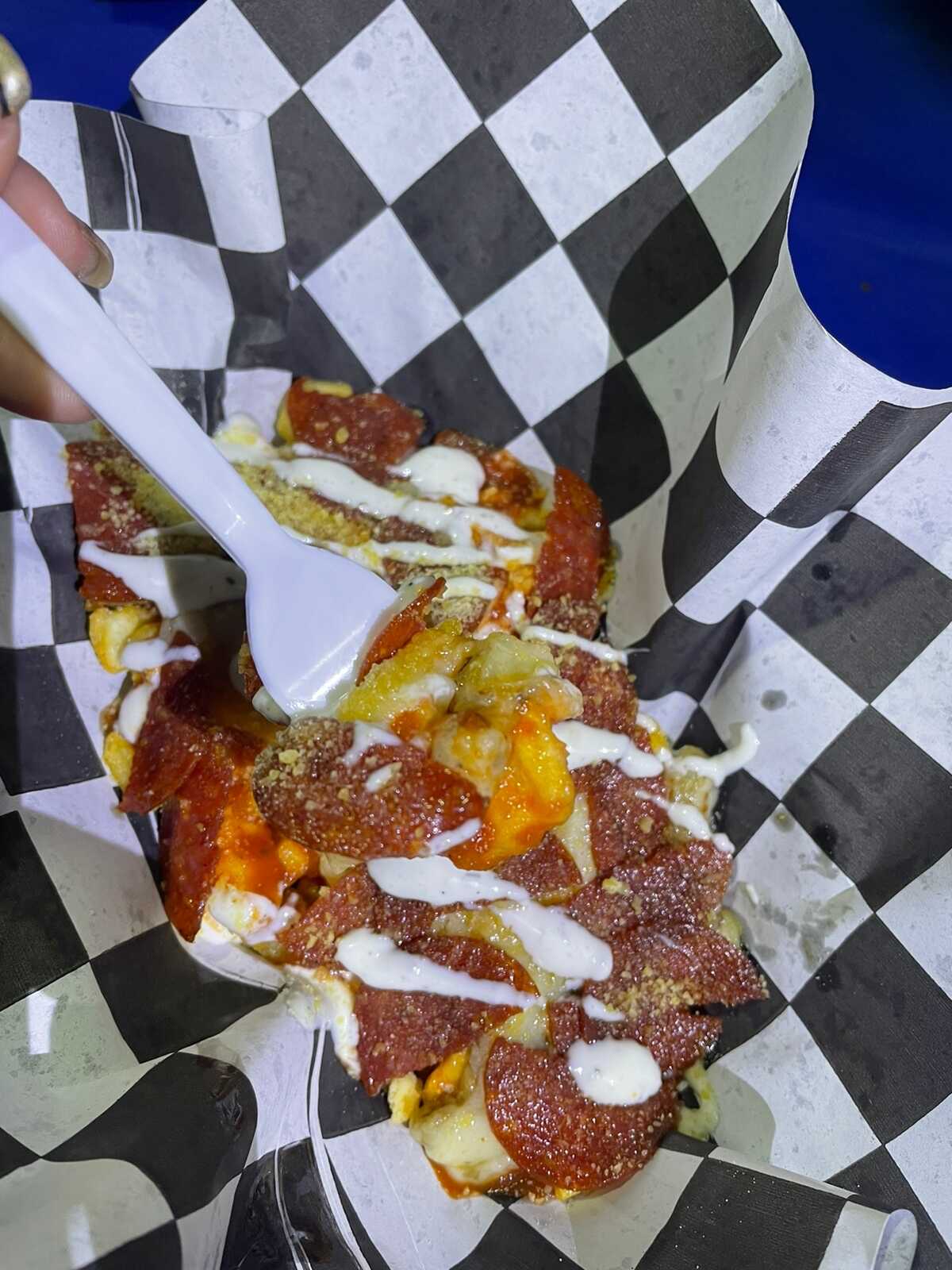200 gramos de papas, salsa de pizza, queso mozzarella, peperonni, aderezo buttermilk ranch y queso parmesano.
