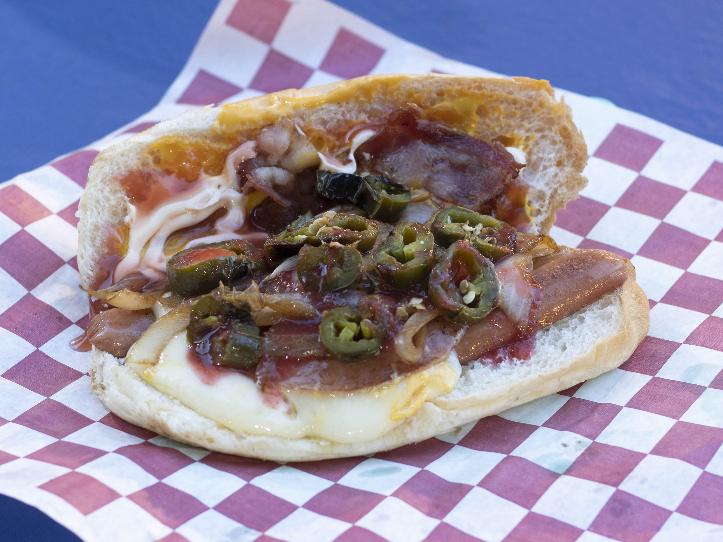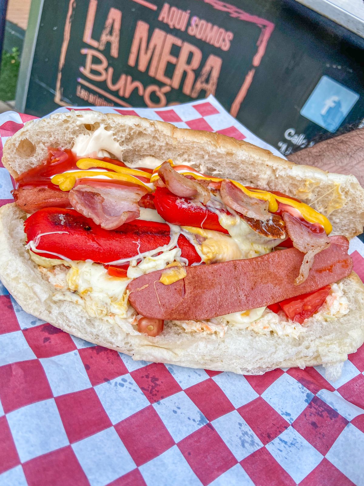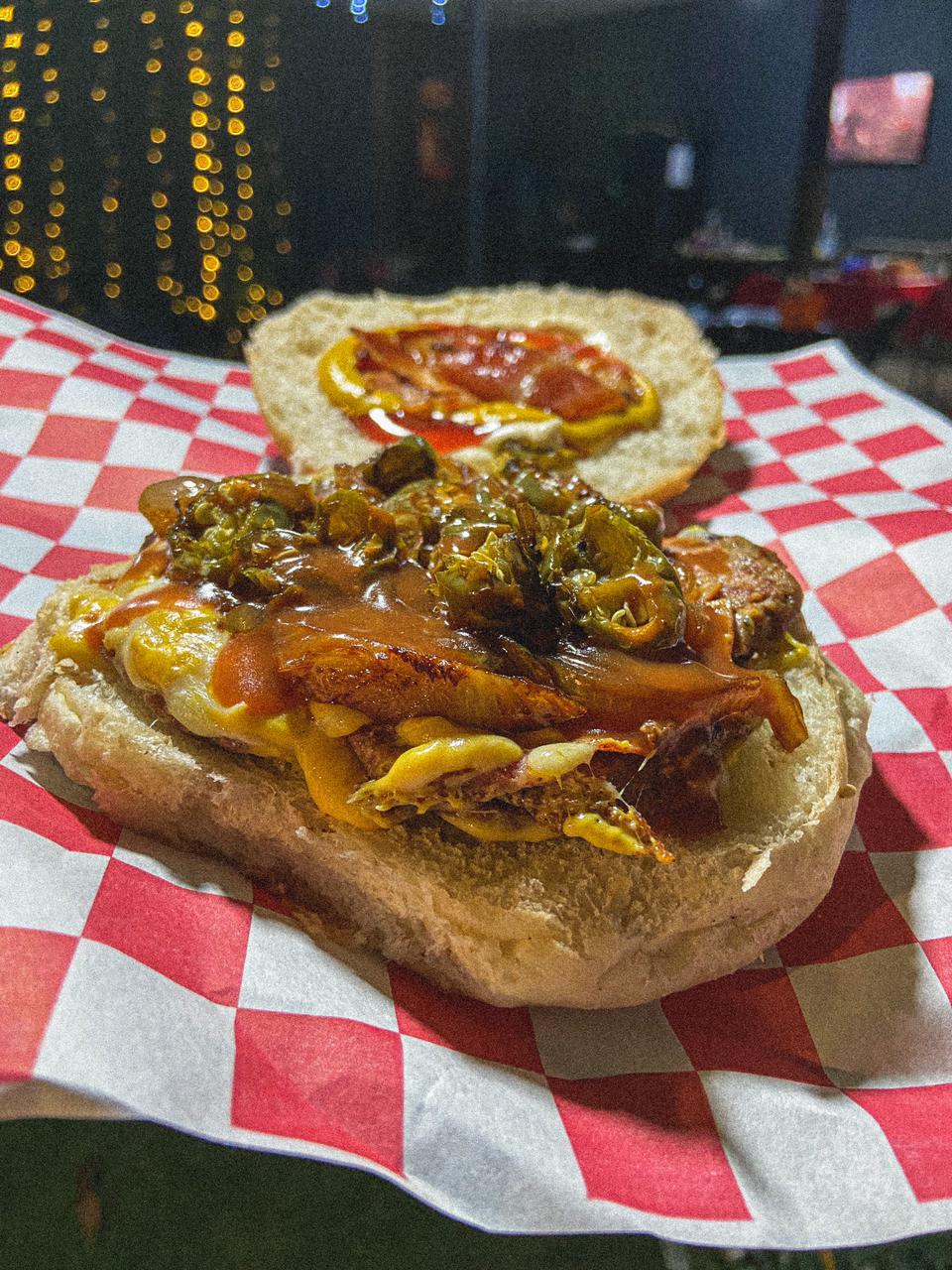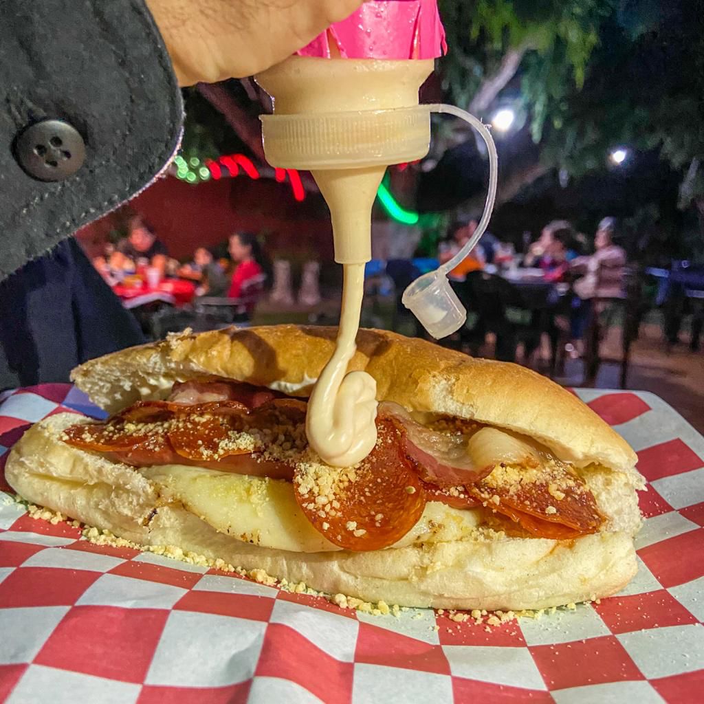 Salchicha, chile jalapeño, jamón, tocino, queso amarillo, queso asadero,cebolla caramelizada, salsa de habanero, mayonesa, mostaza y cátsup.