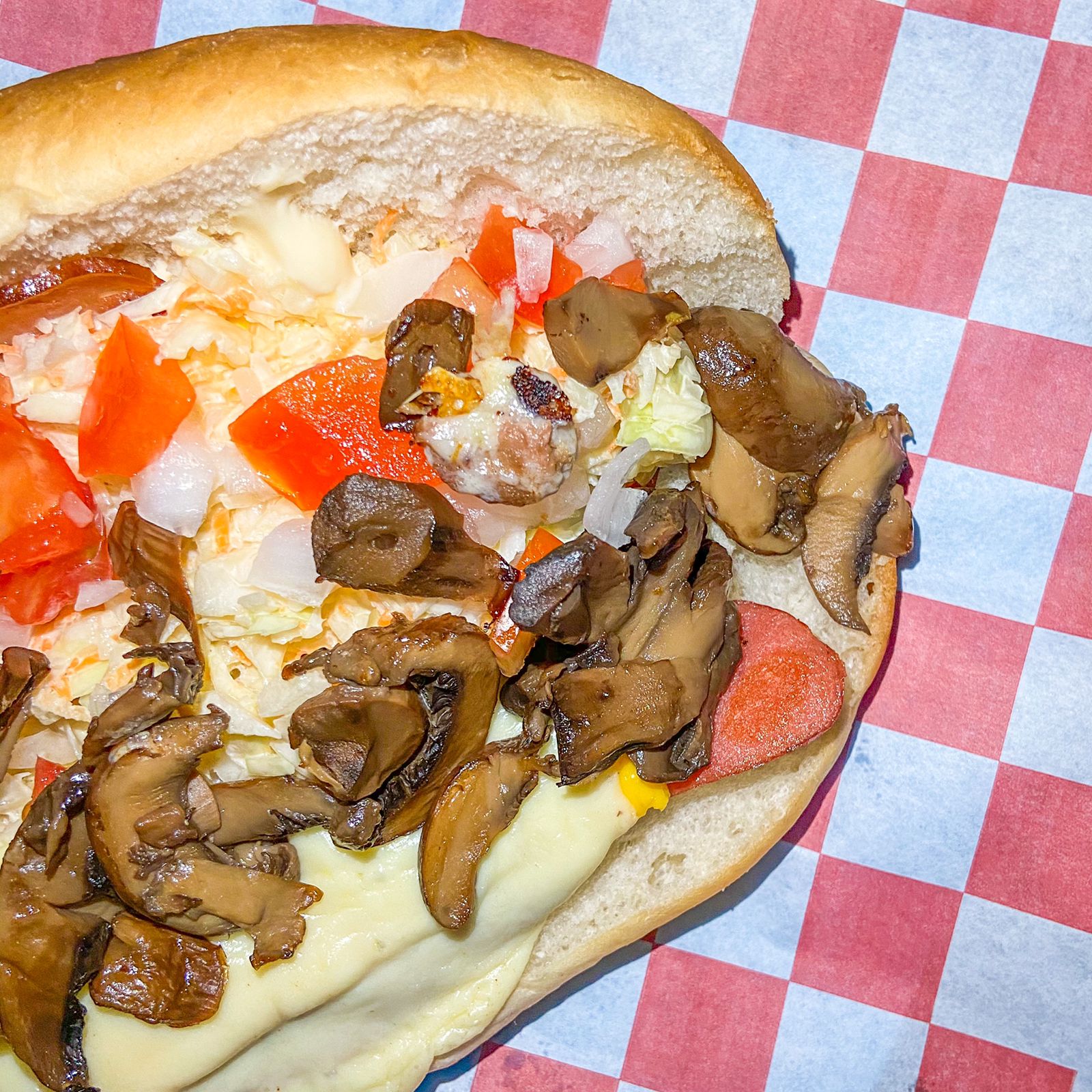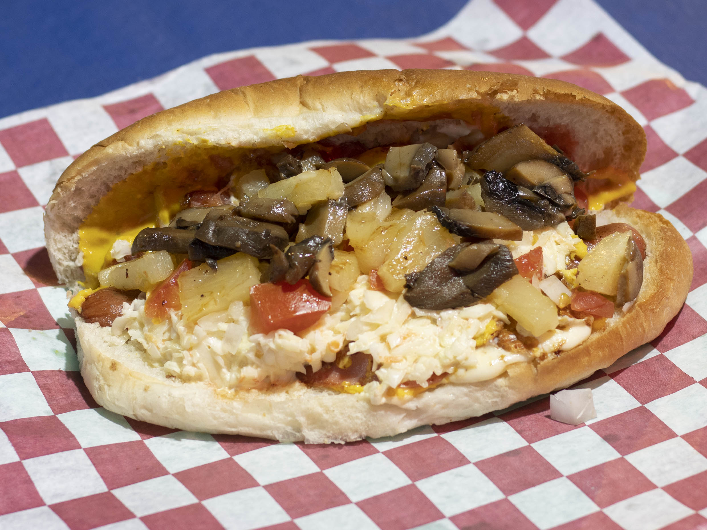 Salchicha de pavo, jamón, tocino, piña, champiñones a la parrilla, queso amarillo, queso asadero,tomate, cebolla, ensalada de col, mayonesa, mostaza y cátsup.