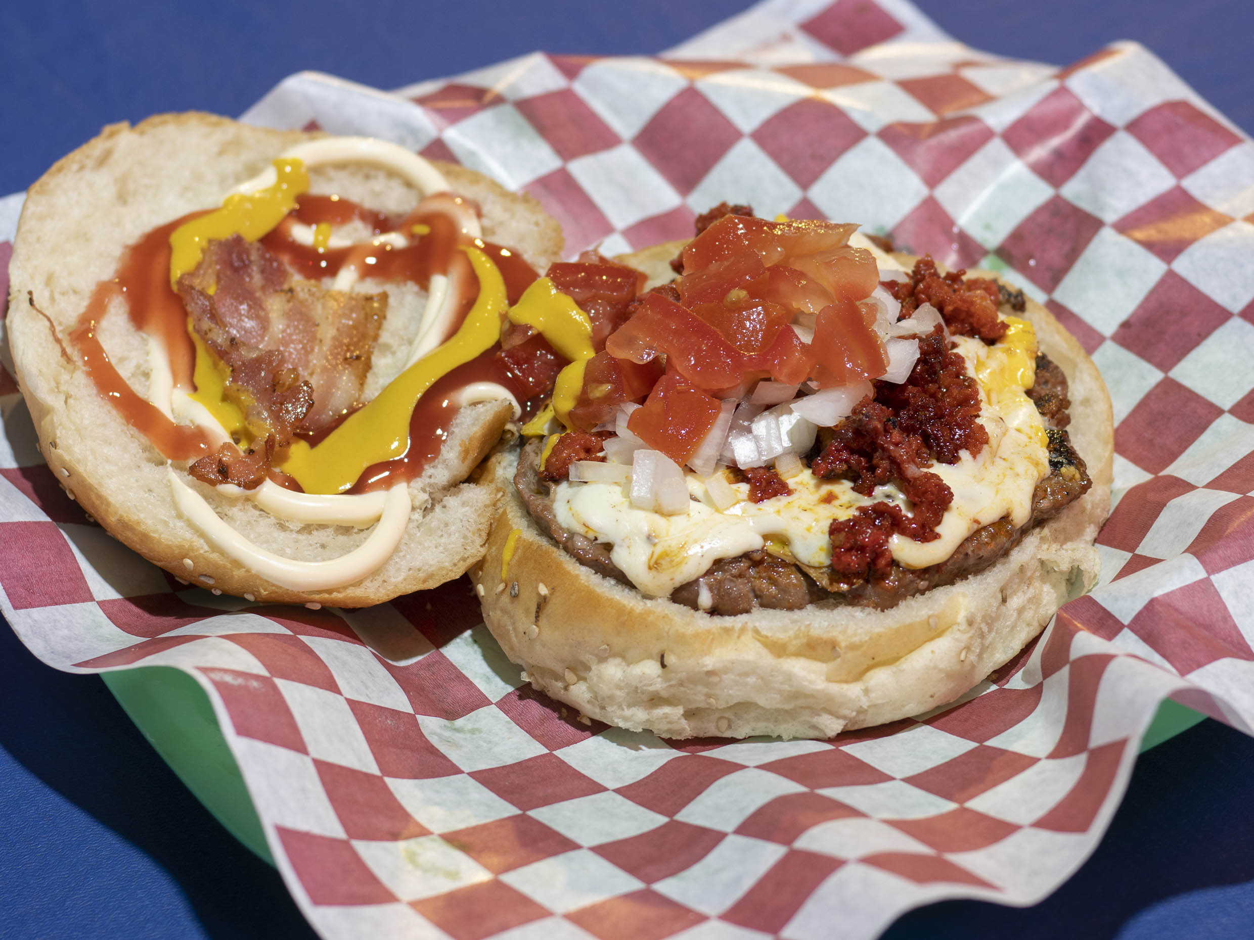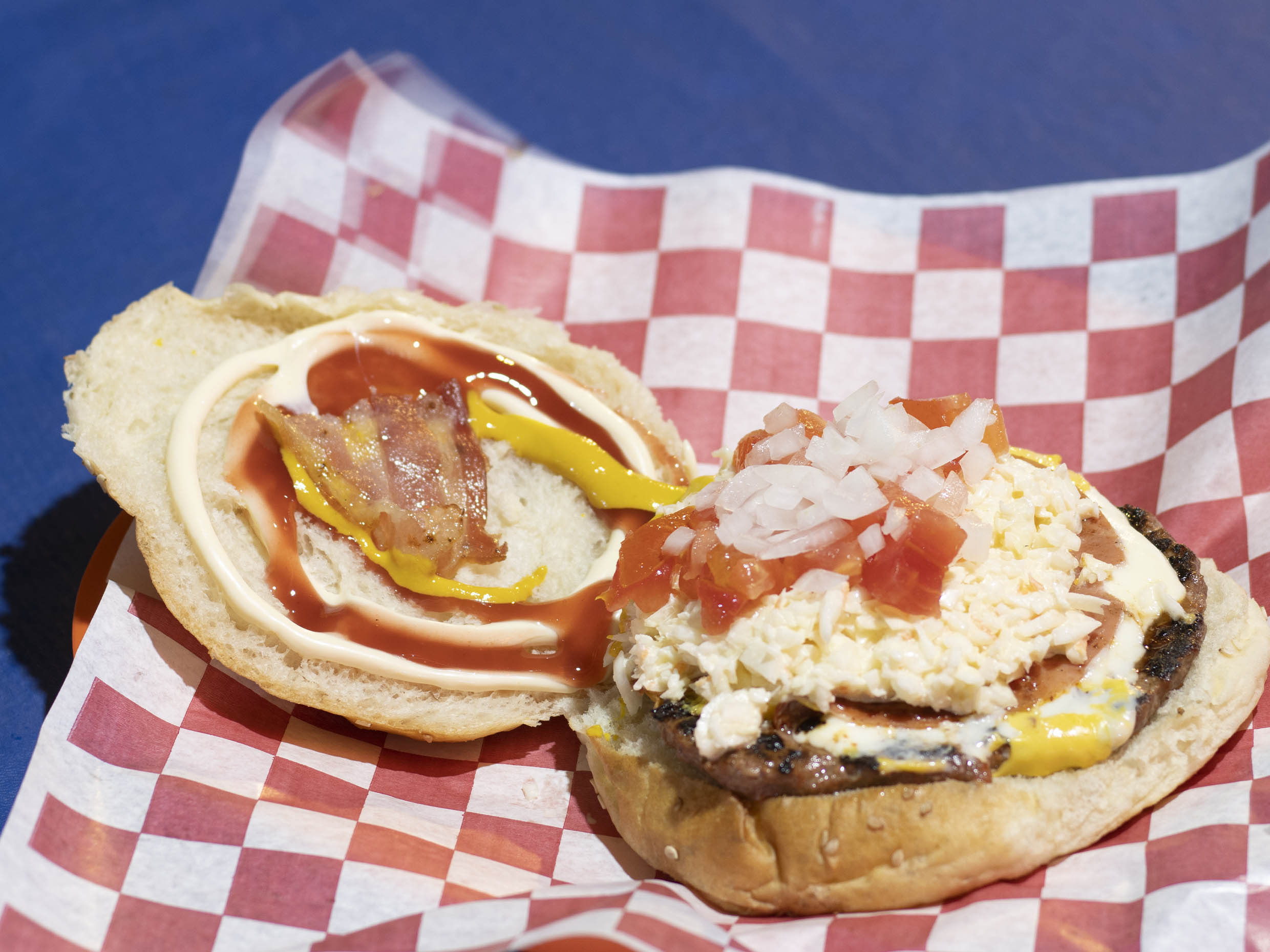 Doble de todo, 2 carnes de 120 gramos, jamón, queso amarillo, queso asadero, tocino, ensalada de col, tomate, cebolla, mayonesa, mostaza y cátsup.