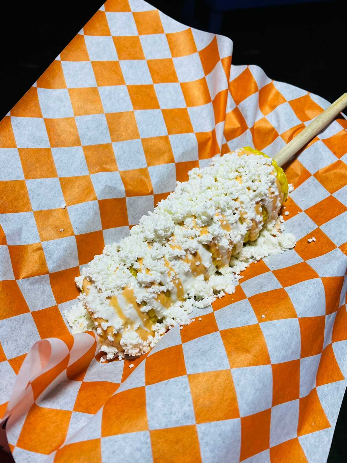 Jugoso elote amarillo con aderezo, buttermilk ranch, aderezo especial y queso fresco molido.