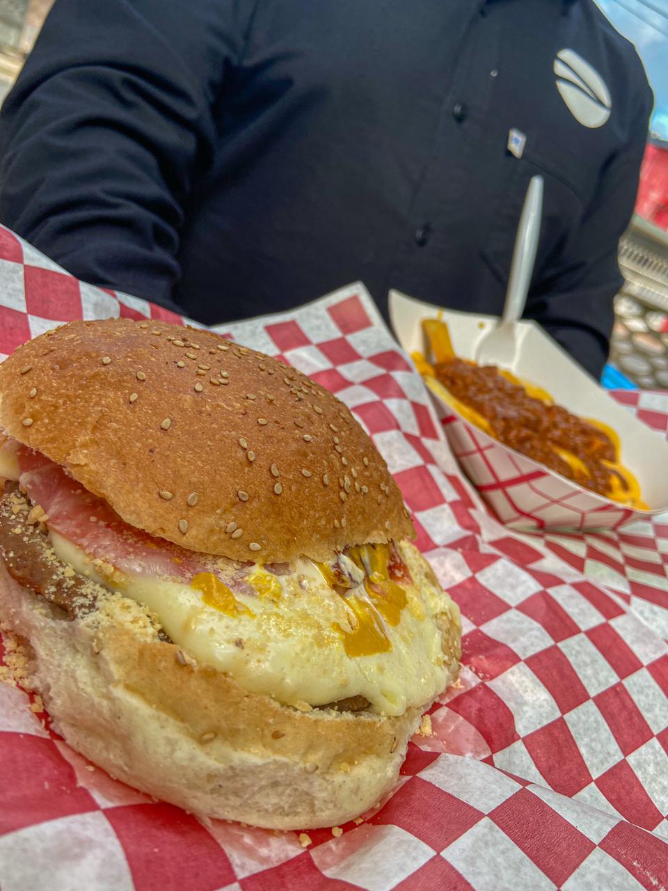 120 gramos de carne, jamón, queso amarillo, queso asadero, tocino, mayonesa, mostaza, crujientes aros de cebolla, cebollita caramelizada y cátsup.