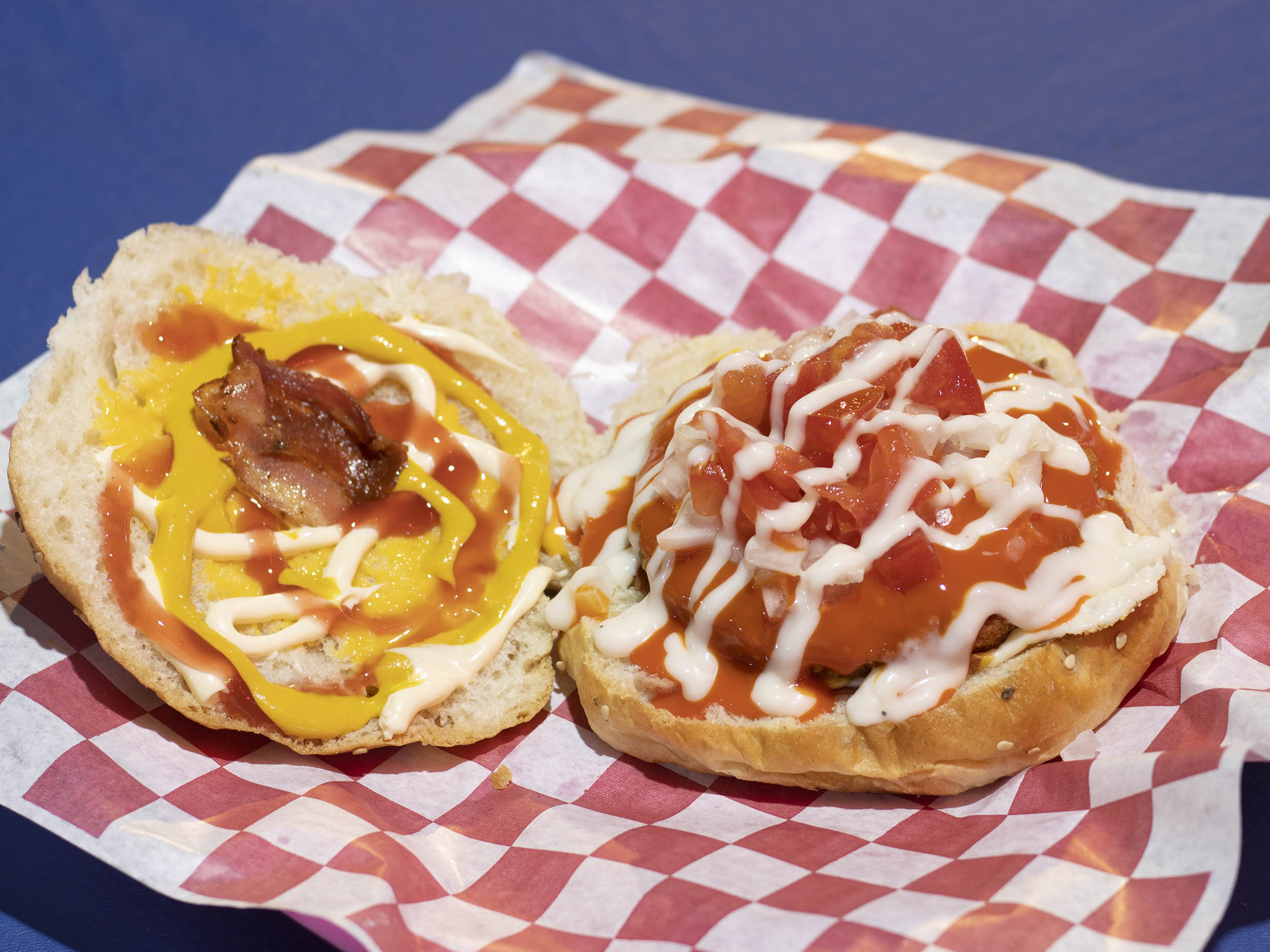 Doradita pechuga de pollo marinada en búfalo, jamón, queso amarillo, queso asadero, queso cheddar, tocino, tomate, cebolla, aderezo blue cheese, mayonesa, mostaza y cátsup.