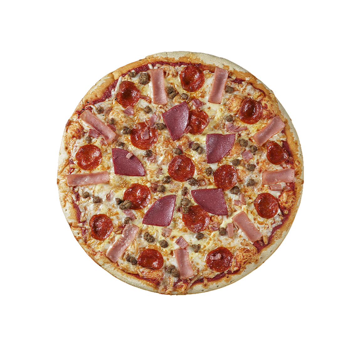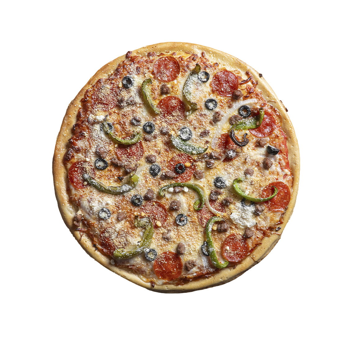 Jamón, salchicha italiana, pepperoni, pimiento verde, champiñones, cebolla, aceituna negra.
