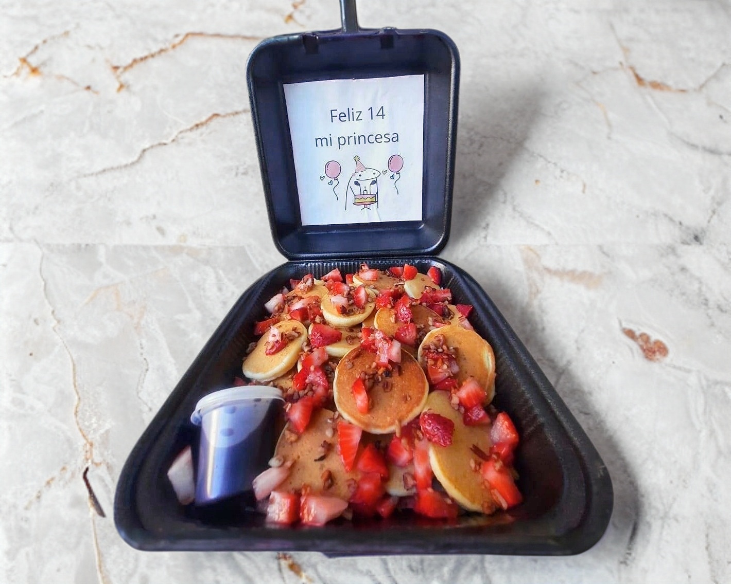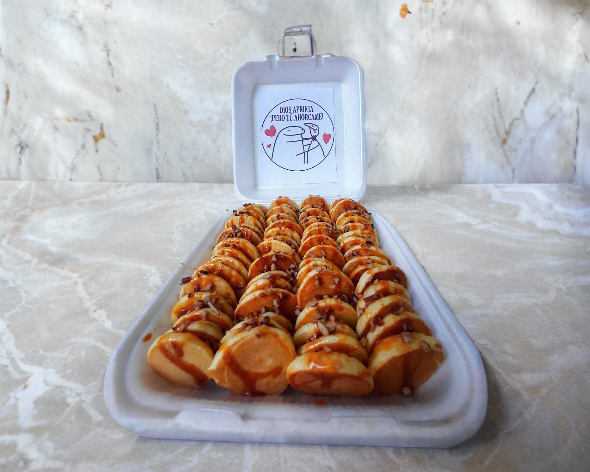45 Mini Hotcakes con cobertura, agrega ingrediente extra.PUEDES AGREGAR UN MENSAJE ESCRITO EN EL PLATO.