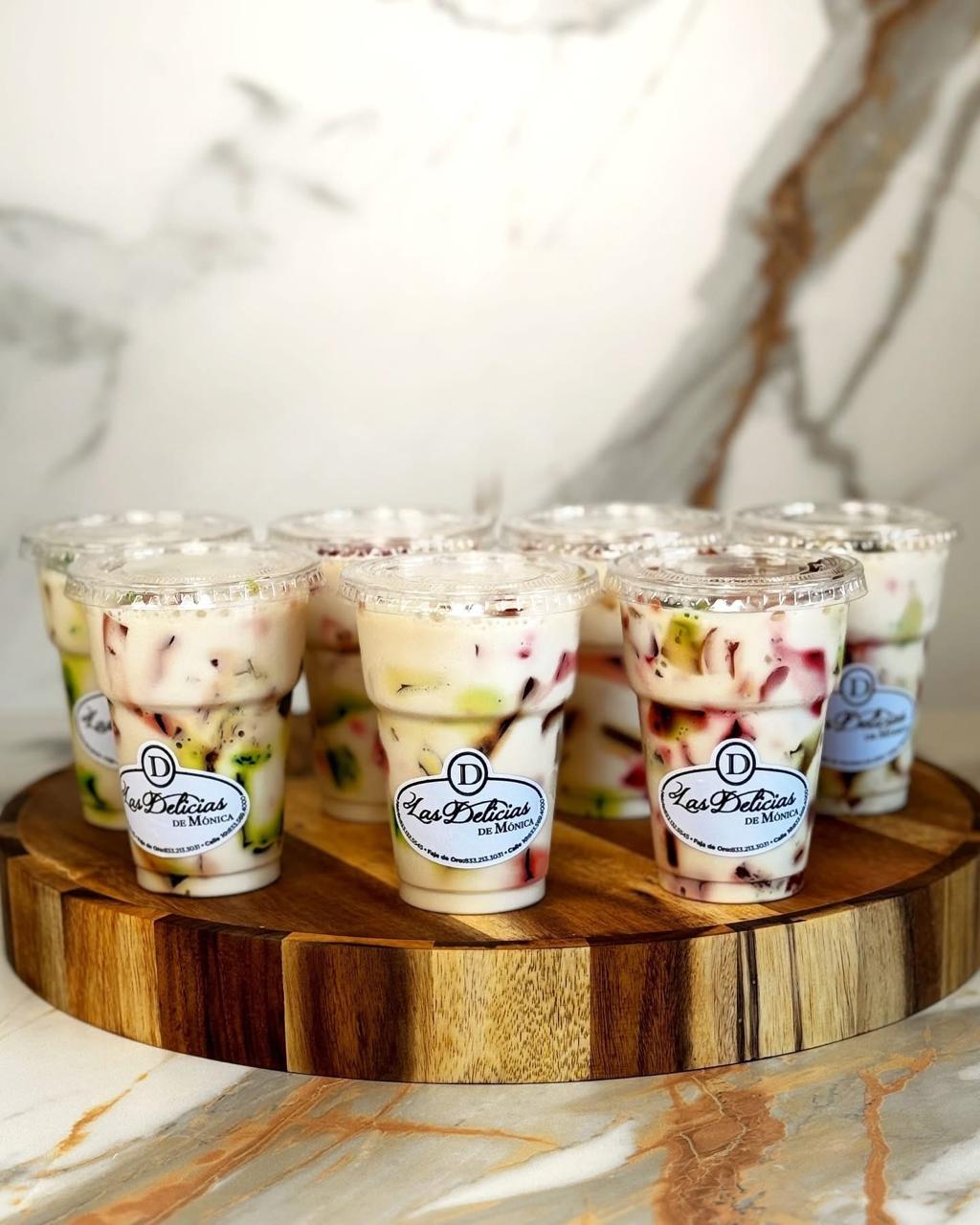 Base de galleta, mezcla de queso crema, decorado con crema batida y cajeta, tamaño individual.
