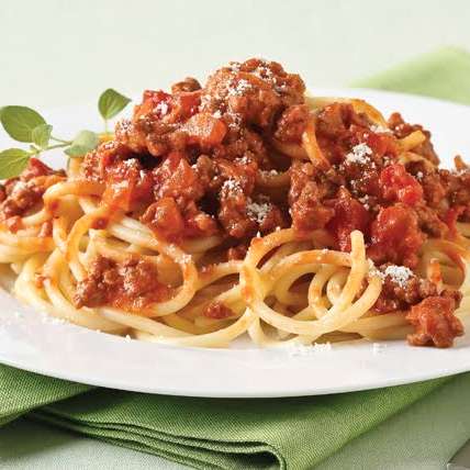 Pasta con salsa de tomate y carne condimentada con sabores italianos, queso gratinado, ensalada verde, aderezo de la casa y pan a las finas hierbas.