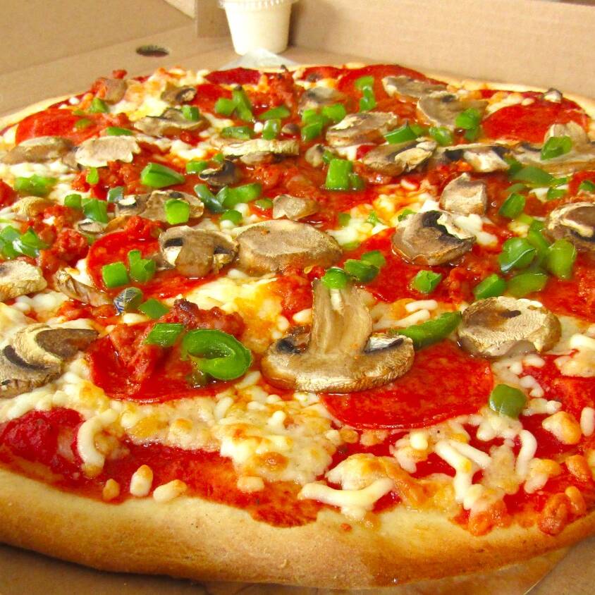 Pizza gourmete en pasta delgada, con salsa marinara, queso, peperoni , chorizo, champiñones y pimiento.