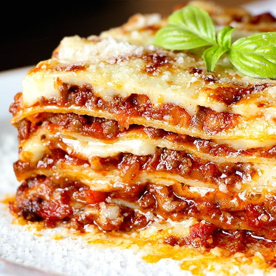 Pasta en capas de salsa de tomate y carne condimentada con sabores italianos, queso gratinado, ensalada verde, aderezo de la casa y pan a las finas hierbas.