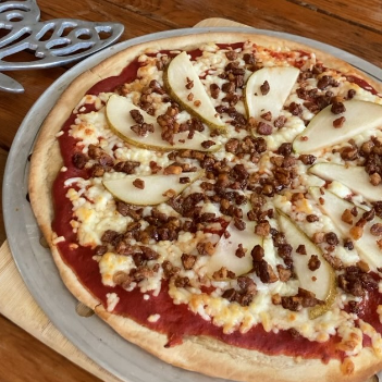 Pizza gourmete en pasta delgada, con salsa marinara, queso, pera dulce y topping de tocino dorado