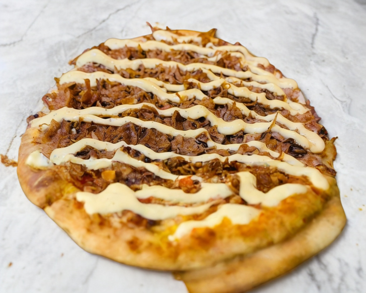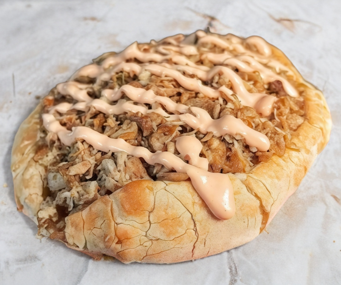 Aderezo, sin lechuga, tomate, cebolla, aguacate y 2 porciones de carne de pierna y arriba un acabado de aderezo de chipotle.