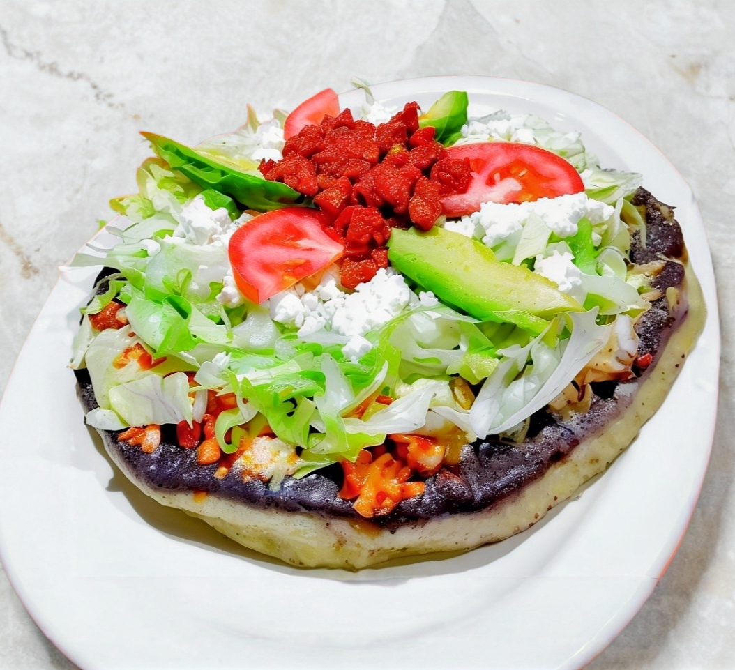 Con Guiso a Escoger incluyen frijoles, queso, aros de cebollamorada, aguacate y crema