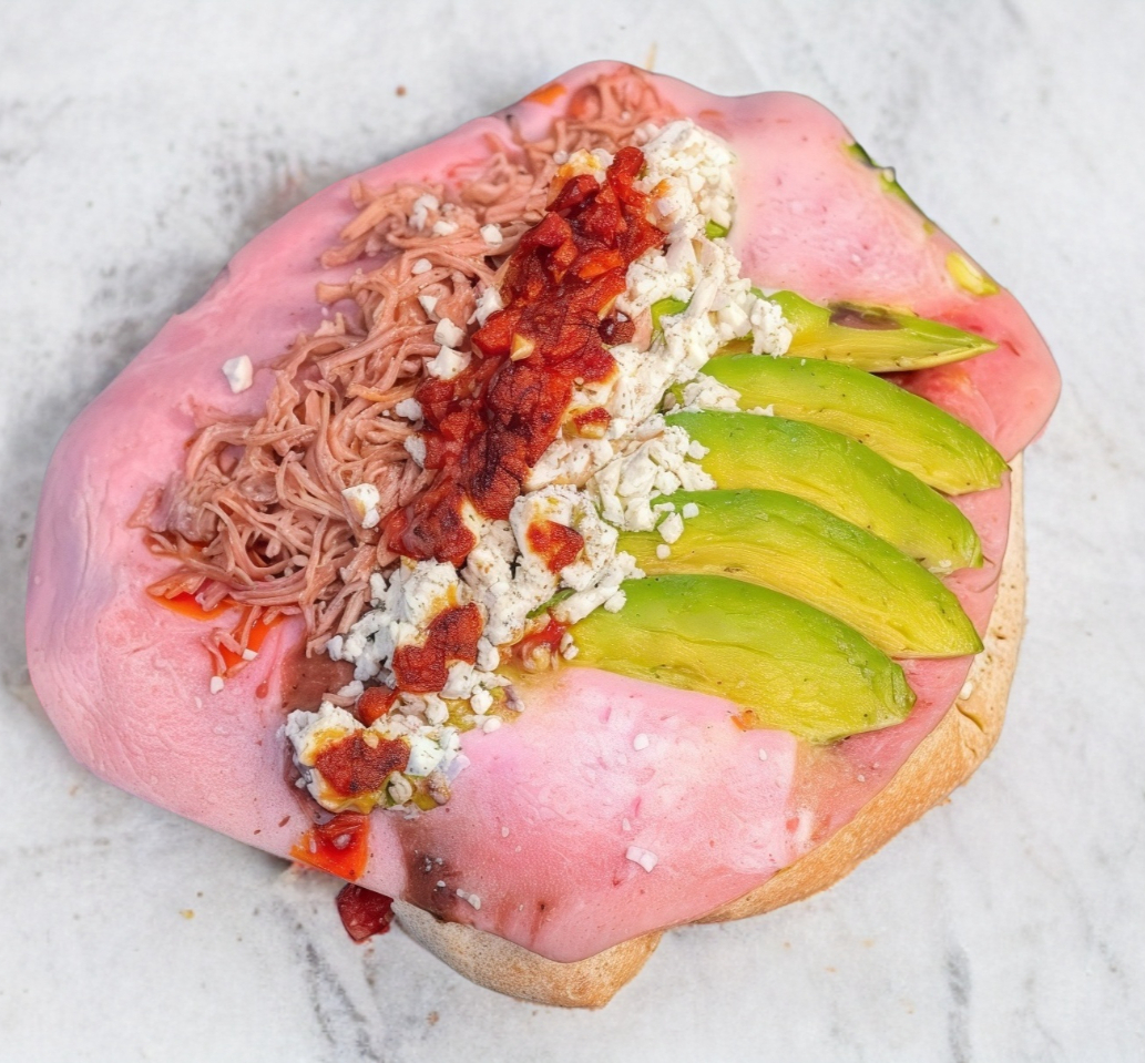 Pan francés, frijoles, 3 rebanadas de jamón del bueno, 2 porciones de queso de puerco, queso amarillo, tomate, cebolla, más aguacate, 2 porciones de carne deshebrada, queso molido fresco y chorizo del bueno.