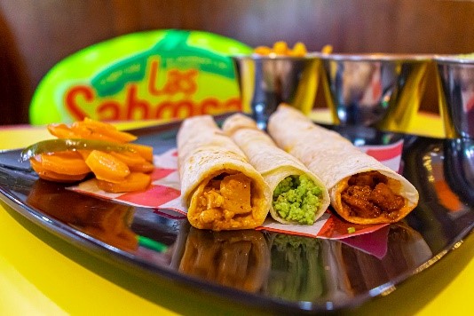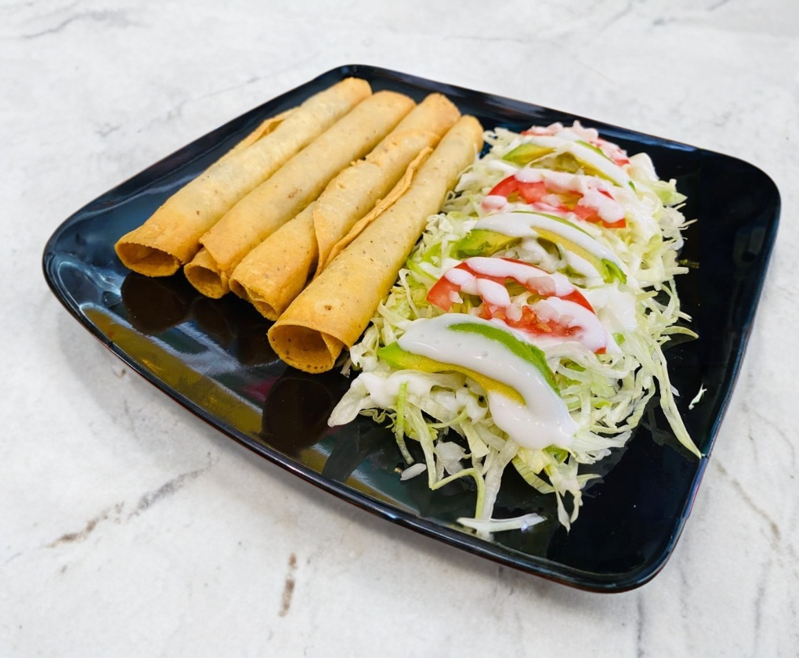 Deliciosa Orden de 4 flautas ( 2 de carne, 1 de frijol y una de papa). Acompañada de lechuga, tómate, cebolla, aguacate, crema, salsa y zanahorias.