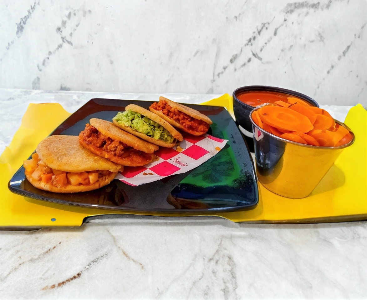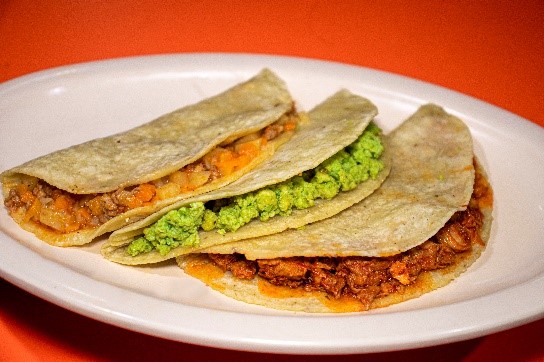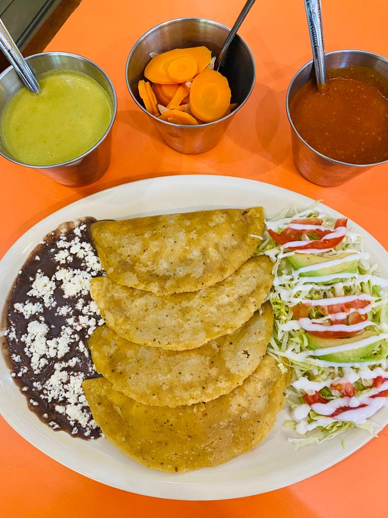 Deliciosa Orden de 4 quesafritas ( 2 quesafritas de queso molido con carne y 2 quesafritas de queso molido). Acompañado de lechuga, tomate, cebolla, aguacate, crema, frijoles refritos, salsa roja y zanahorias.