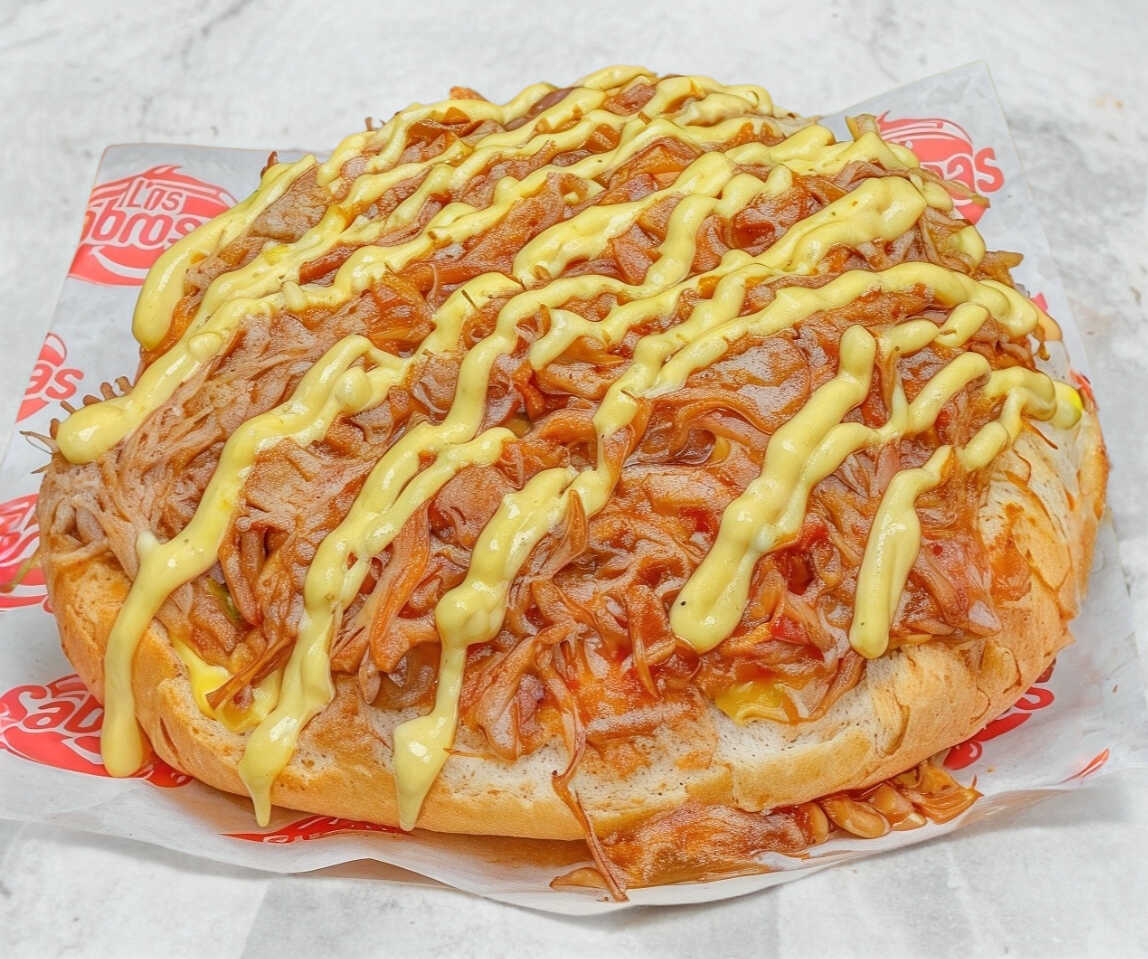 Pan francés, 1 base de aderezo de mostaza, tomate, cebolla, aguacate, 1 porción de jugosa y sabrosa carne de res deshebrada y arriba un acabado de aderezo de mostaza.