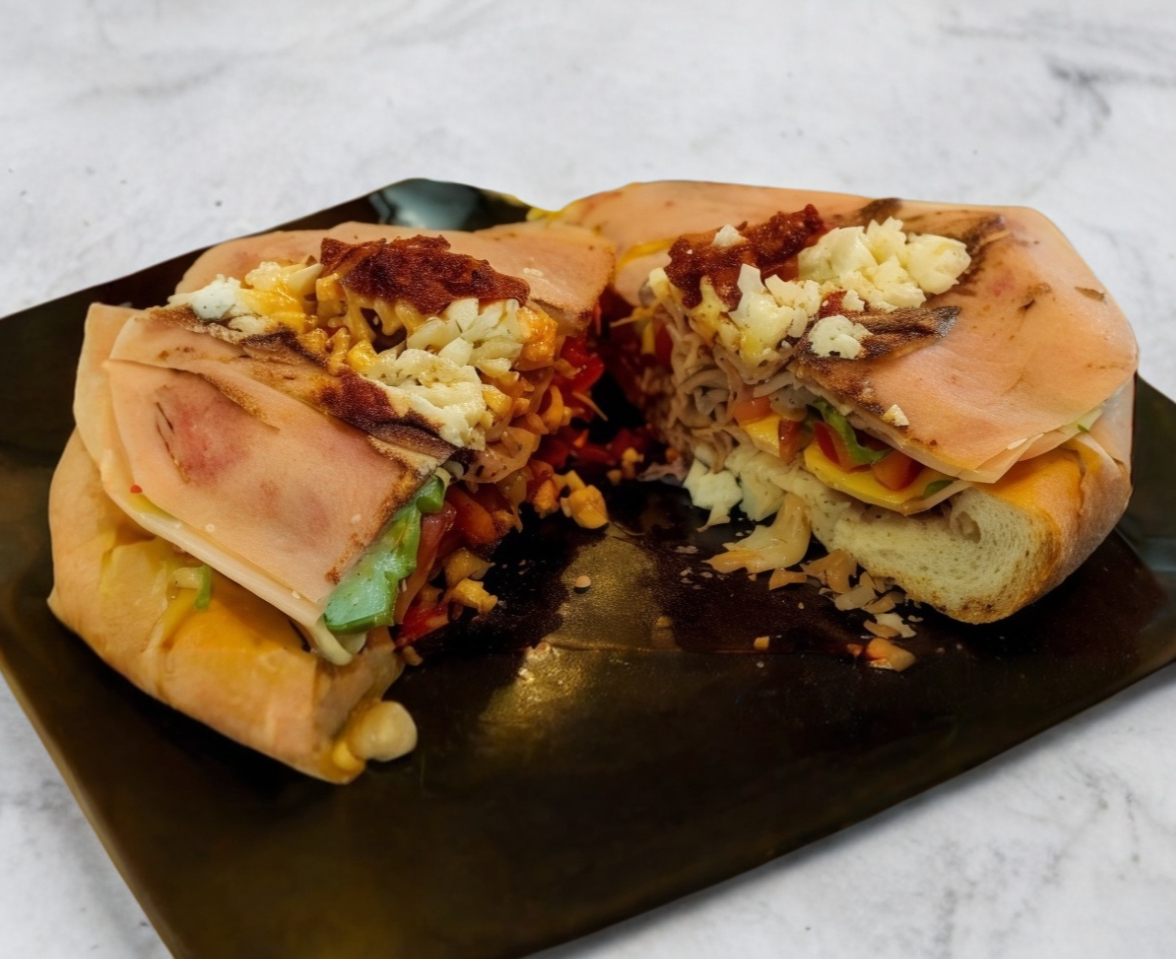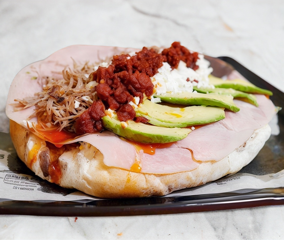 Pan Francés jumbo, 4 rebanadas de jamón del bueno, 4 porciones de queso de puerco, 2 quesos amarillo, tomate, cebolla, aguacate, chicharrón seco, 4 porciones de queso molido fresco, chorizo del bueno, media porción de carne de puerco y arriba un acabado de aderezo chipotle