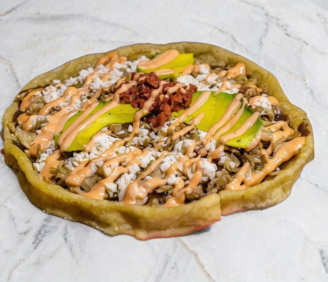 incluyen frijoles, queso, aros de cebolla morada, aguacate y crema