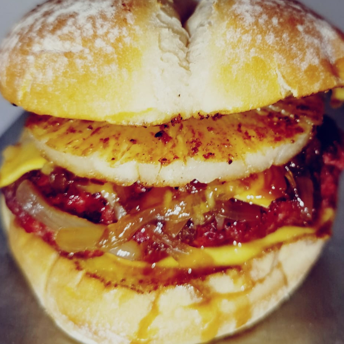 Carne de res casera, Queso Americano, Cebollita asada con champiñones, Piña con canela y Aderezo especial de la casa en el pan
