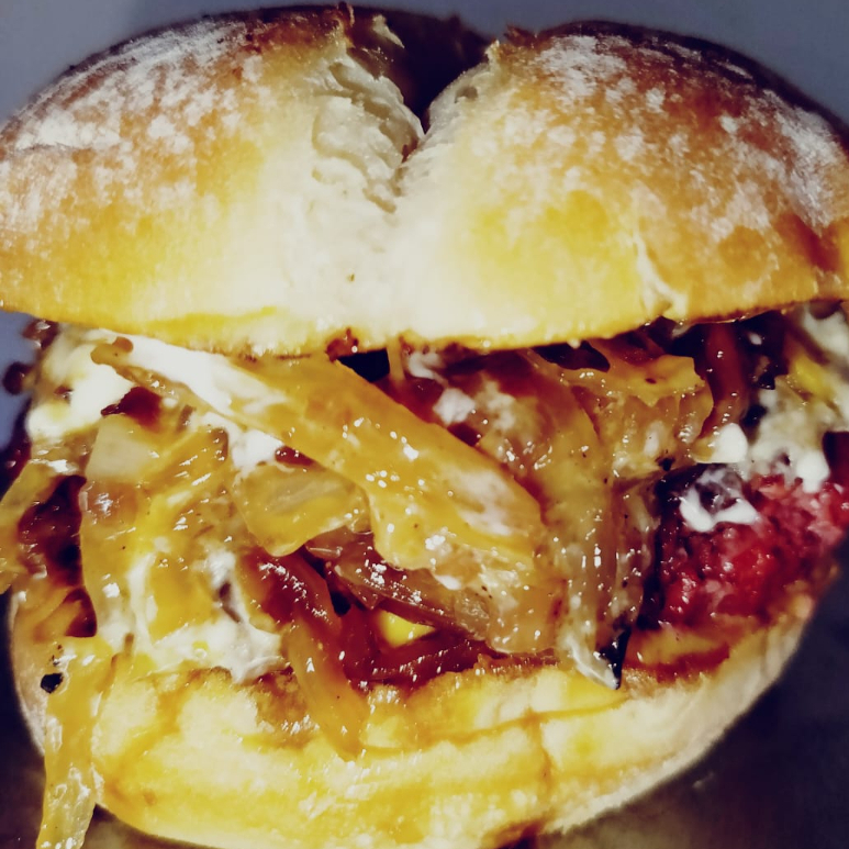 Carne de res casera, Queso Philadelphia, Cebollita asada con champiñones, y Aderezo especial de la casa en el pan