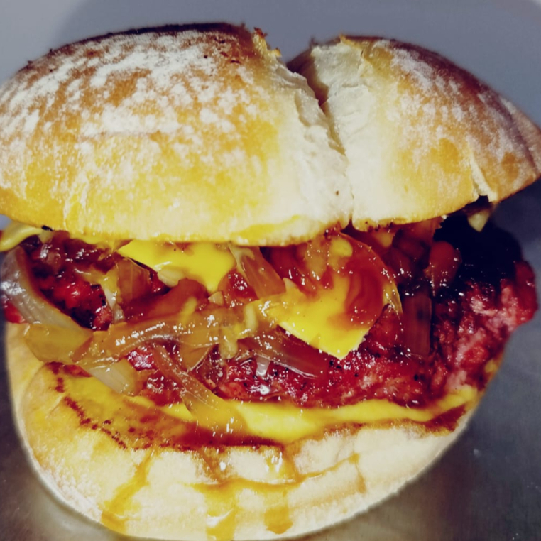 Carne de res casera, Queso Americano, Cebollita asada con champiñones y Aderezo especial de la casa en el pan