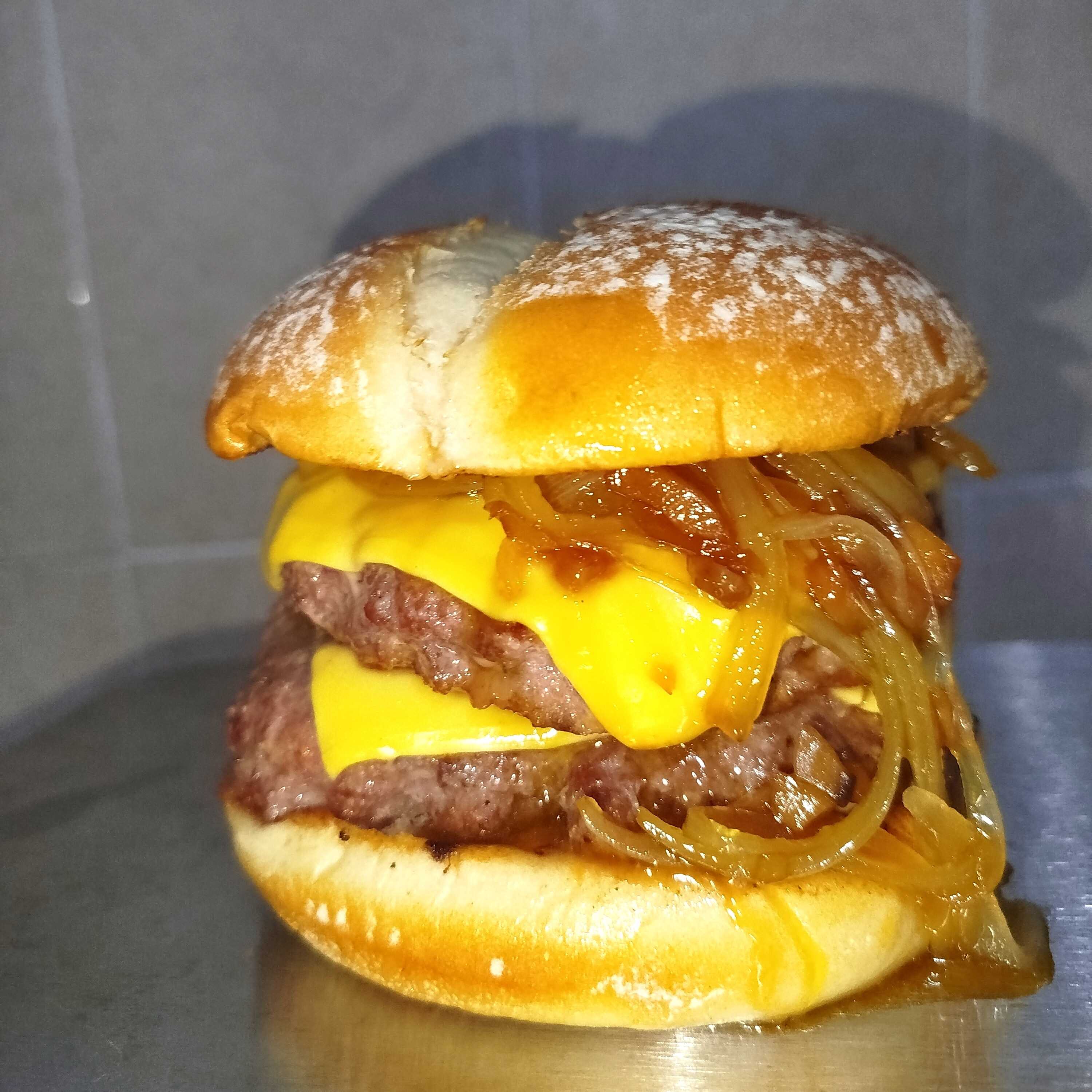 2 Carnes de res caseras, 2 Quesos Americanos, Cebollita asada con champiñones y Aderezo especial de la casa en el pan