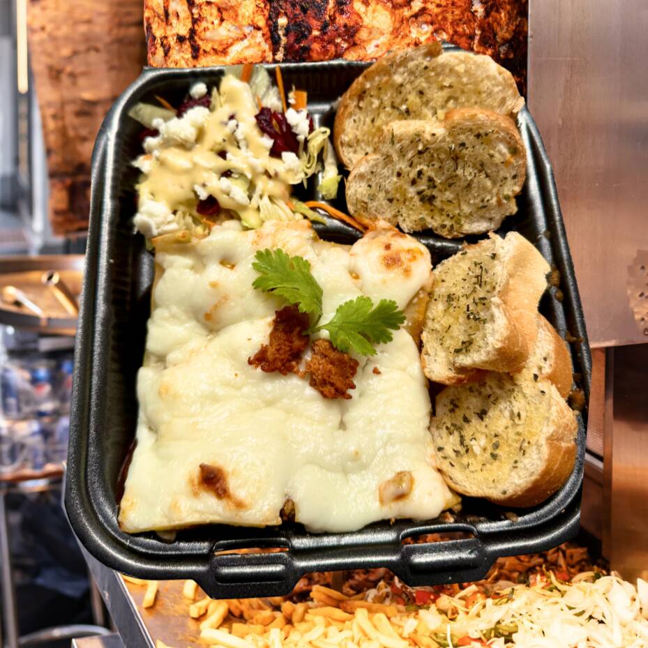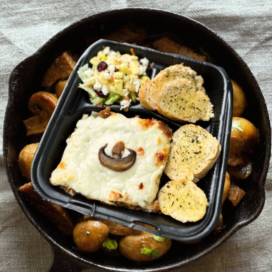 Paquete de deliciosa lasaña con capa de queso crema, mozzarella y crema. Acompañado de pan de ajo a las hierbas y ensalada con aderezo de la casa.