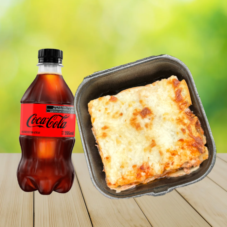 Rebanada de Lasaña de especialidad Acompañada de Una coca cola S/A 355ml, Deli para apetitos Relax.