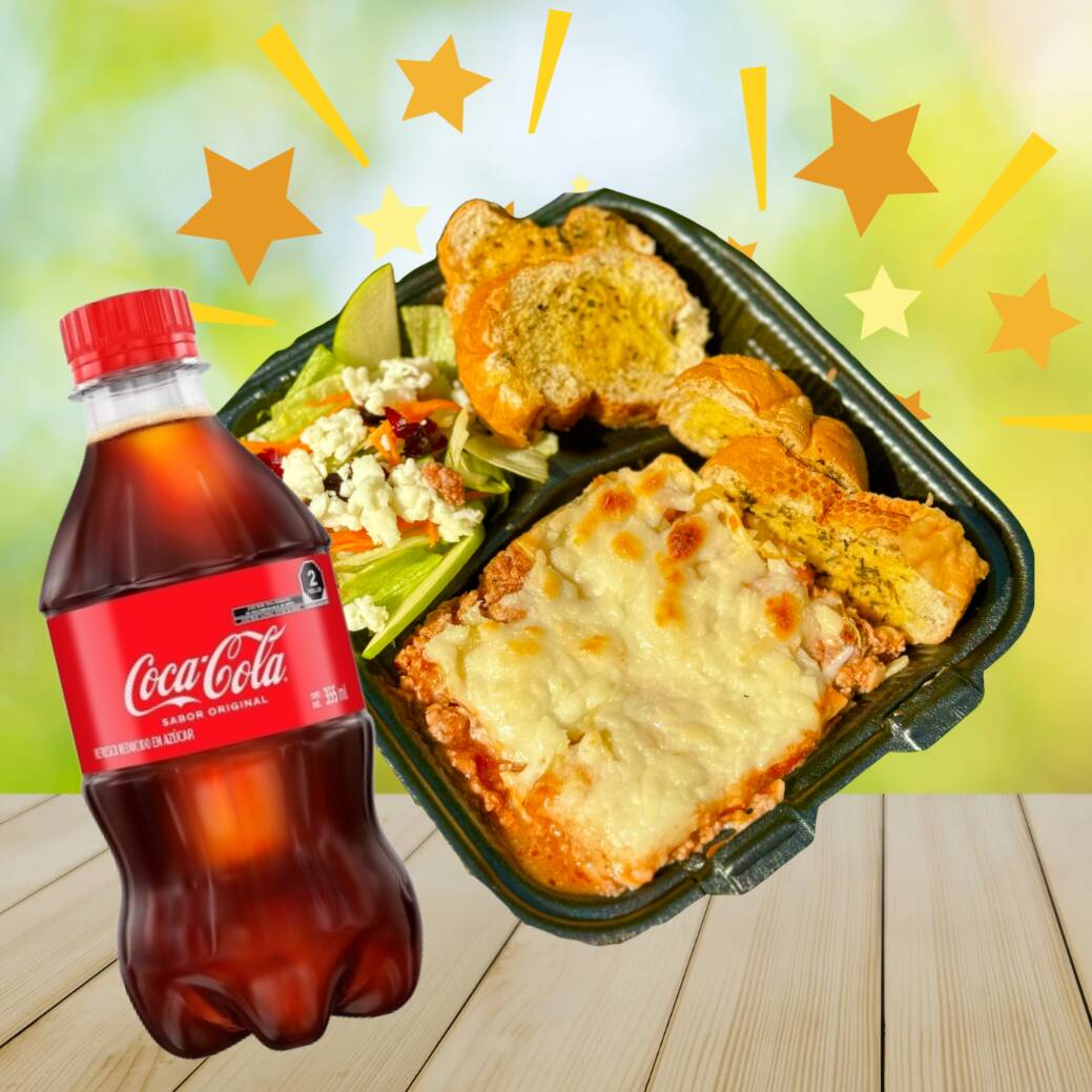 Paquete de Deliciosa lasaña de Cualquier Especialidad a elegir, acompañado de Pan de ajo a las hierbas, Ensalada con aderezo de la casa y 1 botella de Coca cola 355ml.