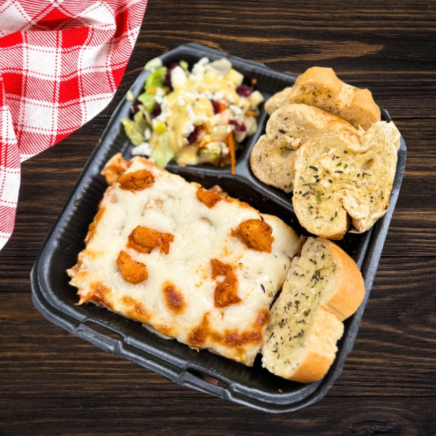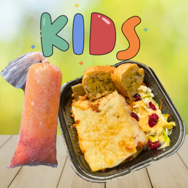 Rebanada de lasaña Extra queso pequeña, acompañada de ensalada de lechuga, arandanos, zanahoria y aderezo. Asi como Pan a las finas hierbas y 1 Hielito de sabor.