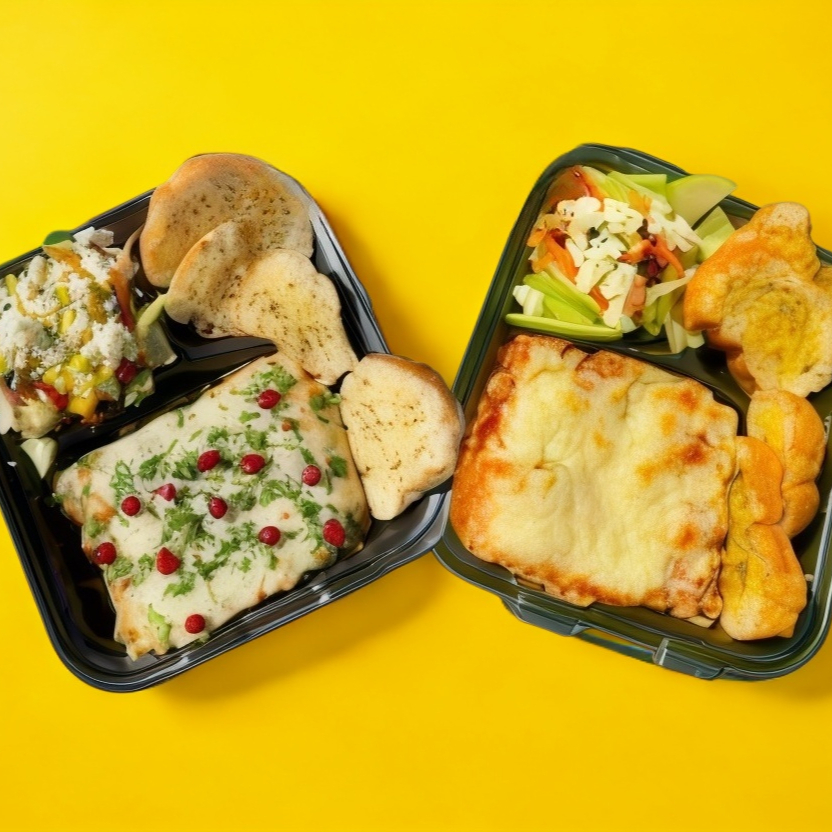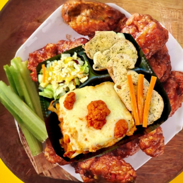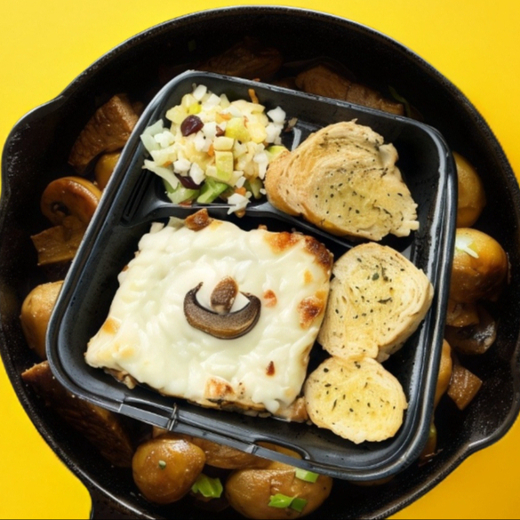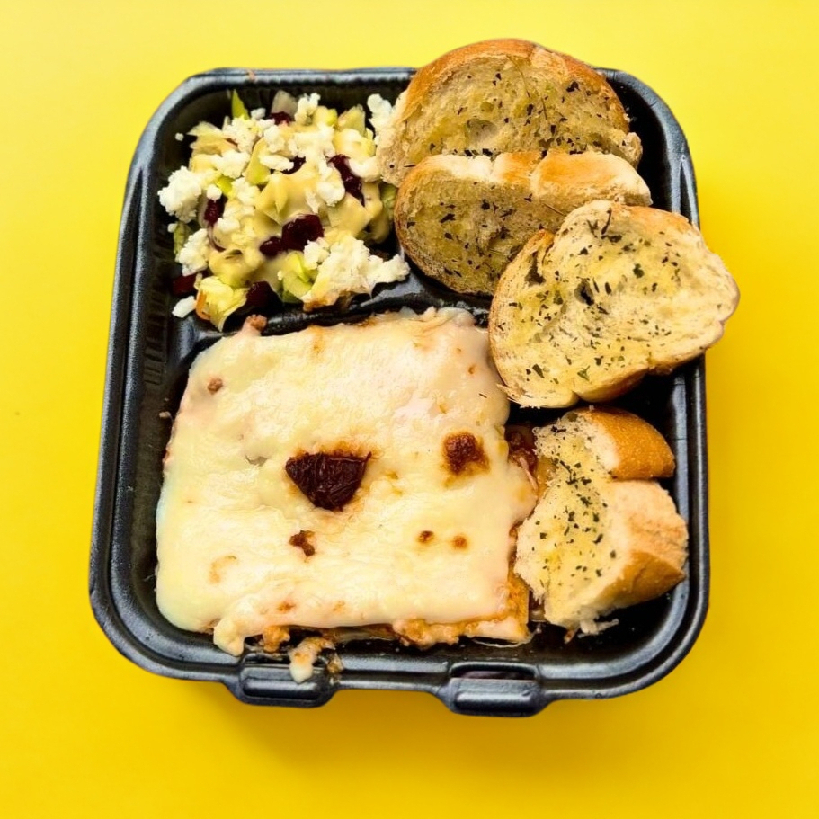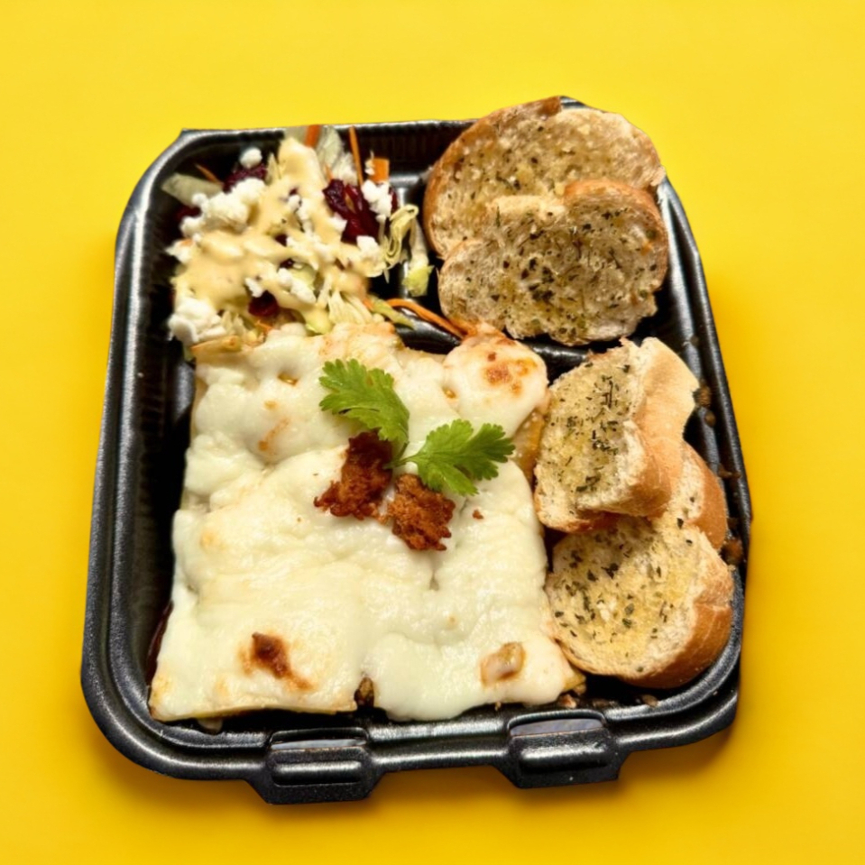 Paquete de Deliciosa lasaña con Capa de Queso Crema, Mozzarella y crema. Acompañado de Pan de ajo a las hierbas y Ensalada con aderezo de la casa.