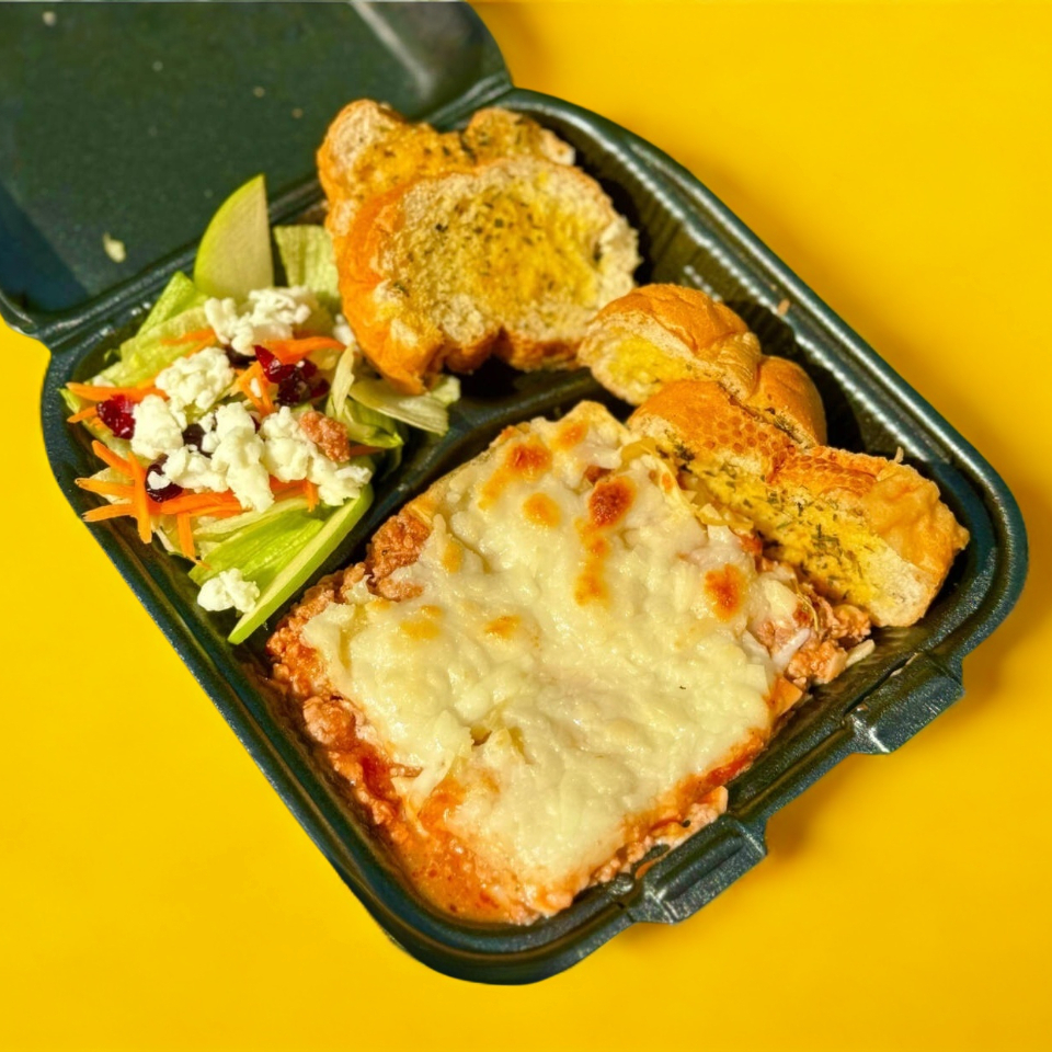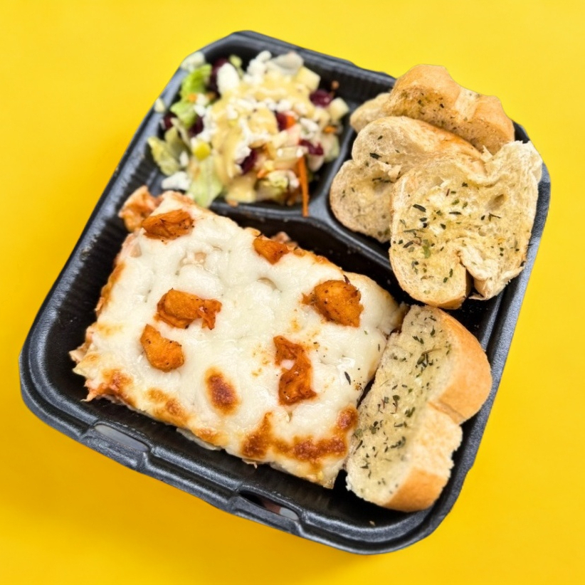 Rebanada de lasaña Extra queso pequeña, acompañada de ensalada de lechuga, arandanos, zanahoria y aderezo. Asi como Pan a las finas hierbas y 1 Hielito de sabor.
