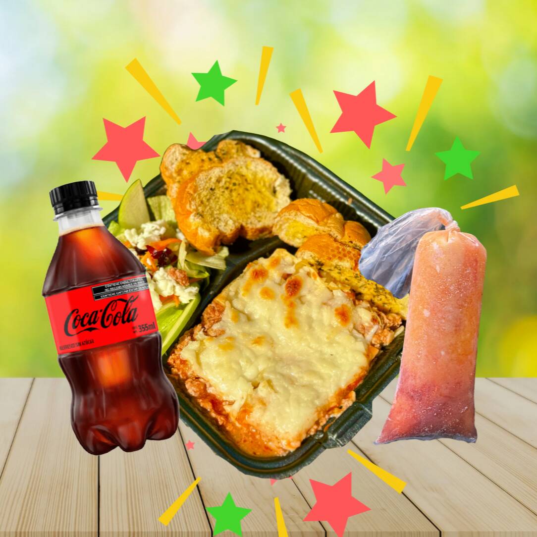 Paquete de Deliciosa lasaña de Cualquier Especialidad a elegir, acompañado de Pan de ajo a las hierbas, Ensalada con aderezo de la casa y 1 botella de Coca cola 355ml.