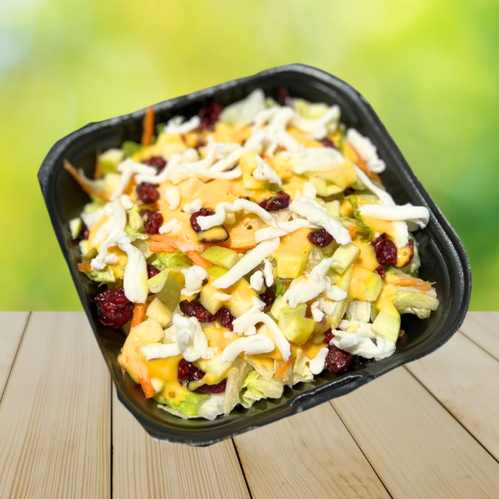 Orden de ensalada a base de lechugas, zanahoria, arandanos y quesos, acompañados del aderezo de la casa.