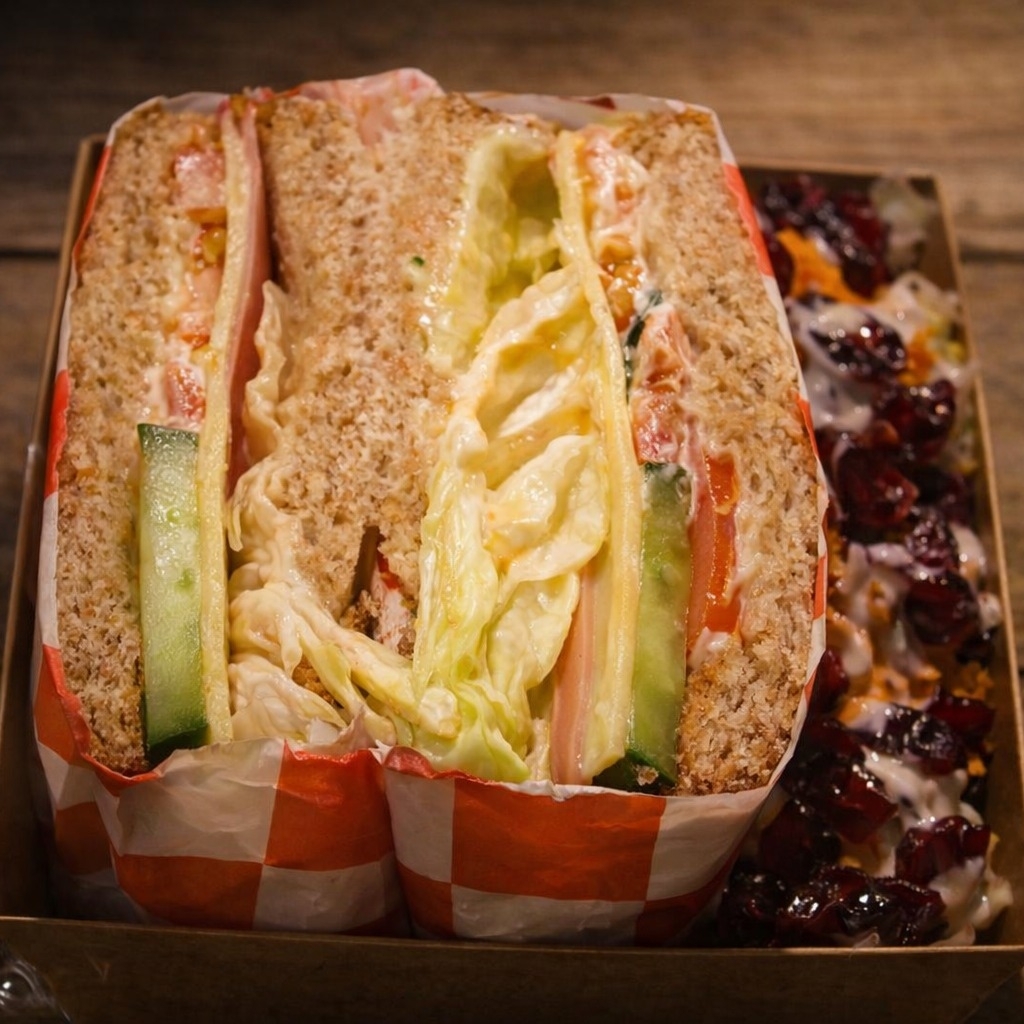 Sándwich Especial Pecas, doble jamon de Pavo, Lechuga, tomate , pepino, Queso Manchego, aderezo de chipotle y aderezo de Aguacate, acompañado de ensalada de lechuga, zanahoria, y arándanos con aderezo cesar