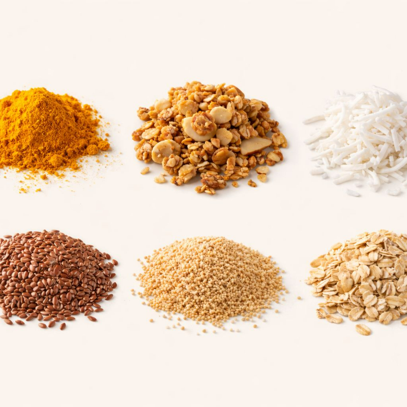 Cúrcuma, Granola, Coco Rallado, Chía, Linaza, Amaranto, Avena, Arándanos, Yogurt