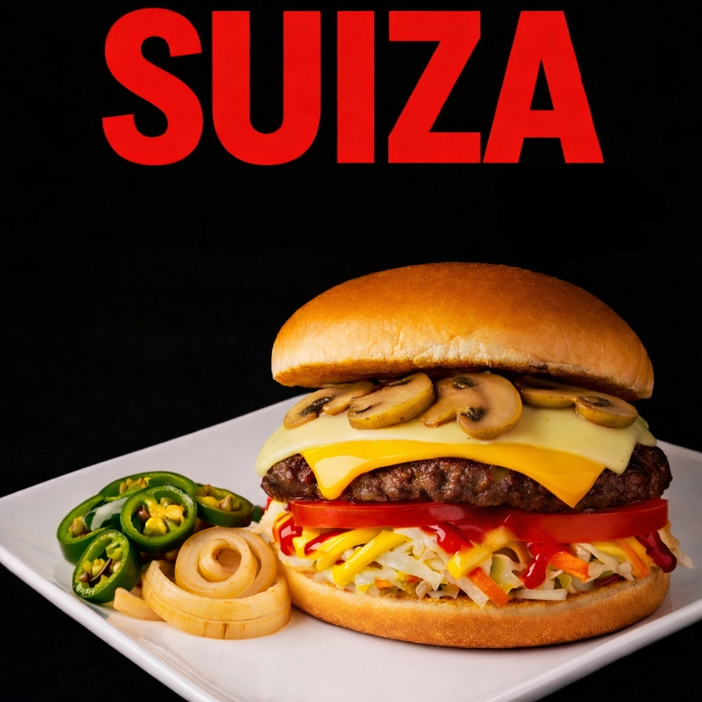 CARNE, QUESO AMARILLO, QUESO ASADERO, CHAMPIÑONES, TOMATE, CEBOLLA Y ENSALADA *No incluyen papas*.