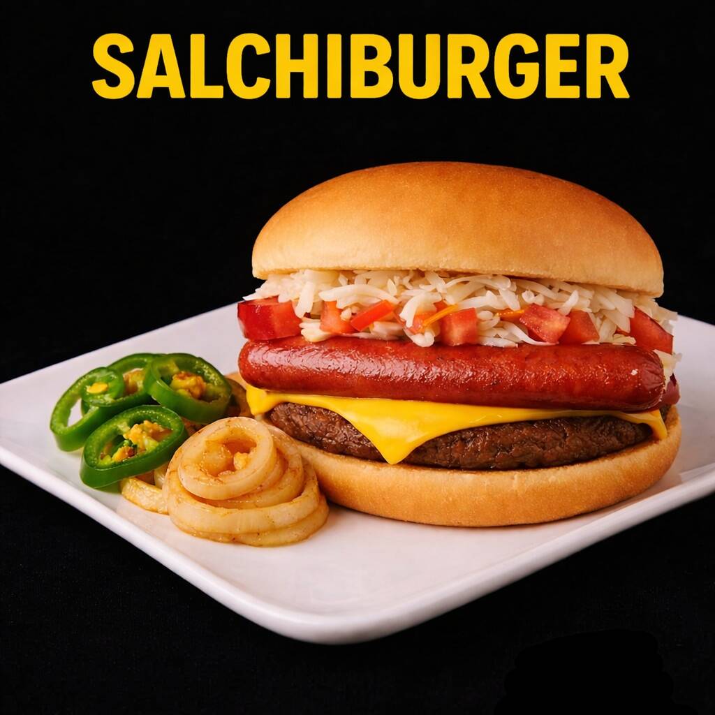 DOBLE CARNE, QUESO AMARILLO, QUESO ASADERO, SALCHICHÓN, TOCINO, TOMATE, CEBOLLA Y ENSALADA (No incluyen papas)