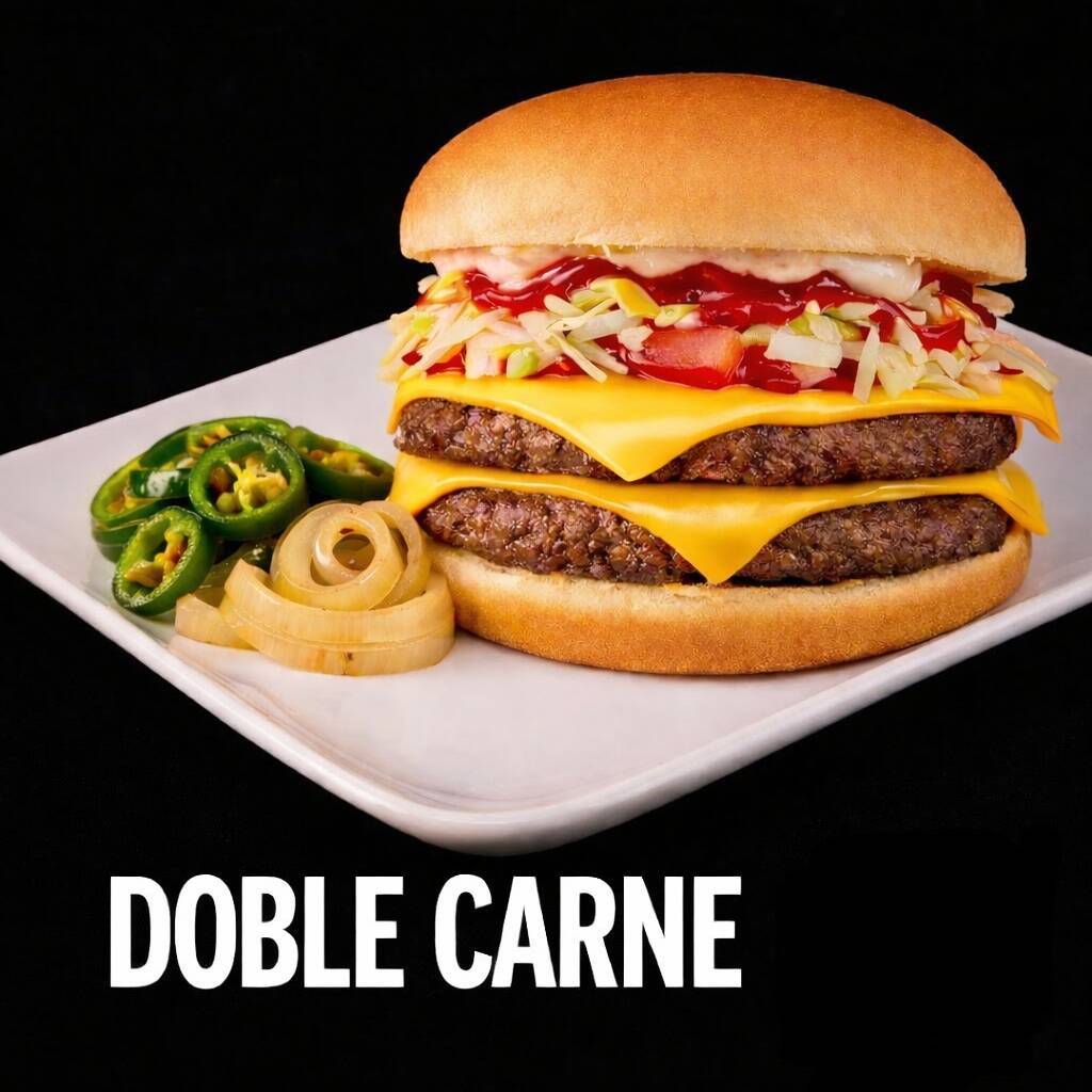 DOBLE CARNE, QUESO AMARILLO, TOMATE, CEBOLLA Y ENSALADA *No incluyen papas*.