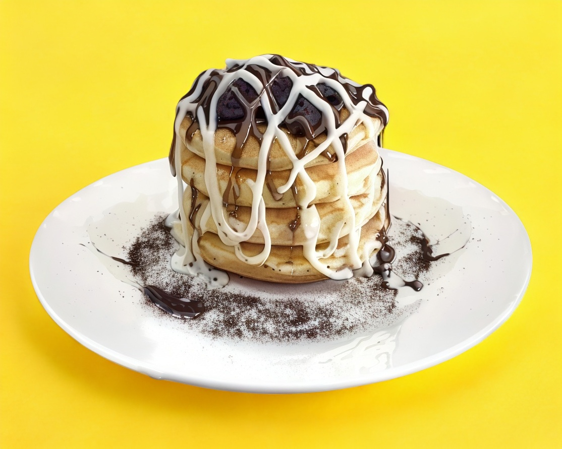 Hot cakes ( 4 piezas) tradicionales rellenos de trocitos de queso crema, decorados con galleta oreo, Nutella y betún sabor queso crema.