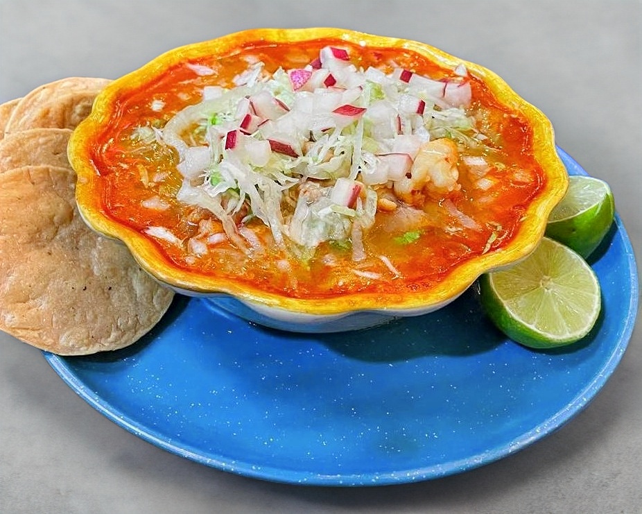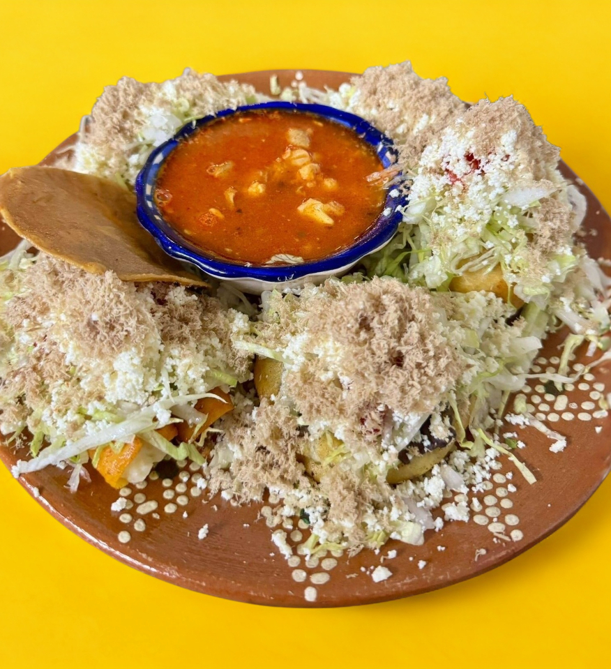 1 Pozole chico, 2 tacos, 1 molote, 1 sope, 1 tostada y 1 flauta surtido. Incluye rábano y limón.