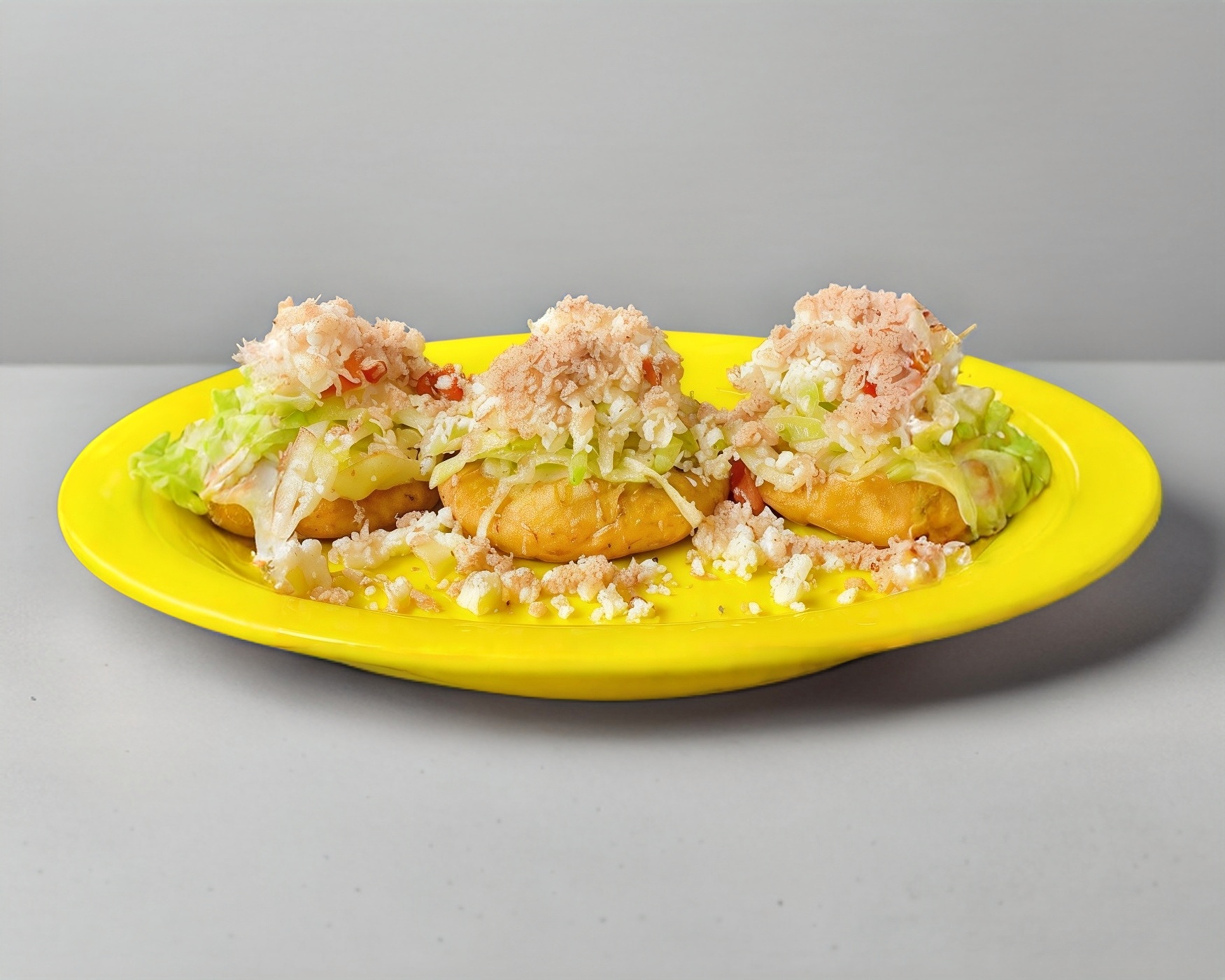 sope indivual relleno de papa o frijo, acompañado de lechuga, tomate, cebolla, queso y carne
