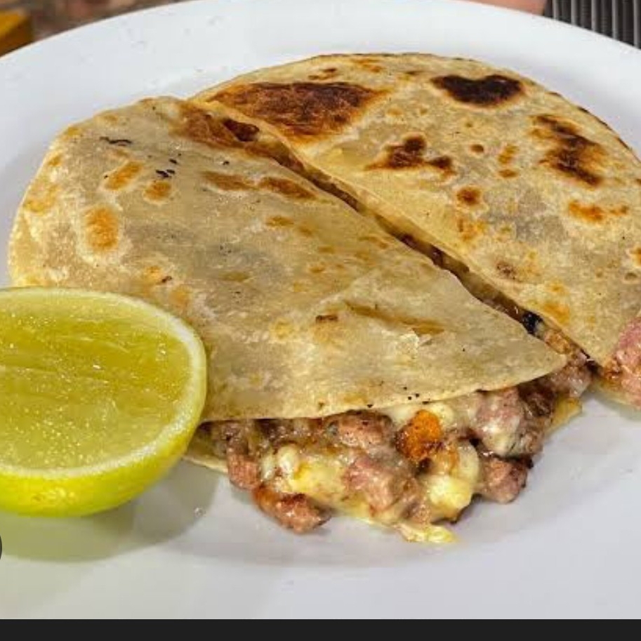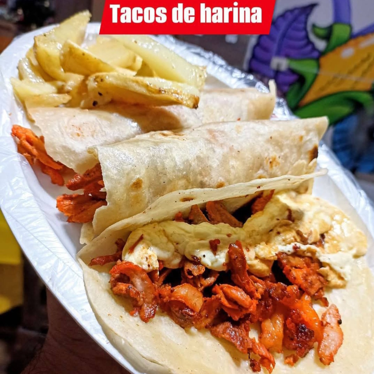 Taco de harina con queso asadero de cualquier carne con cebolla, cilantro, aguacate y papas fritas