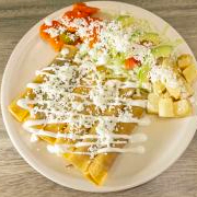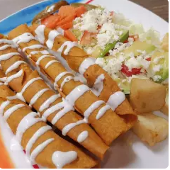 4 FLAUTAS RELLENAS DE CARNE DESHEBRADA O PECHUGA DE POLLO, FRIJOLITOS, ENSALADA Y PAPAS FRITAS, BAÑADAS EN UNA DELICIOSA SALSITA DE CHIPOTLE
