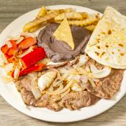120 GR DE BISTEC A LA PLANCHA, CEBOLLITAS CON SALCHICHON, FRIJOLITOS, PAPAS FRITAS, DOS QUESADILLAS